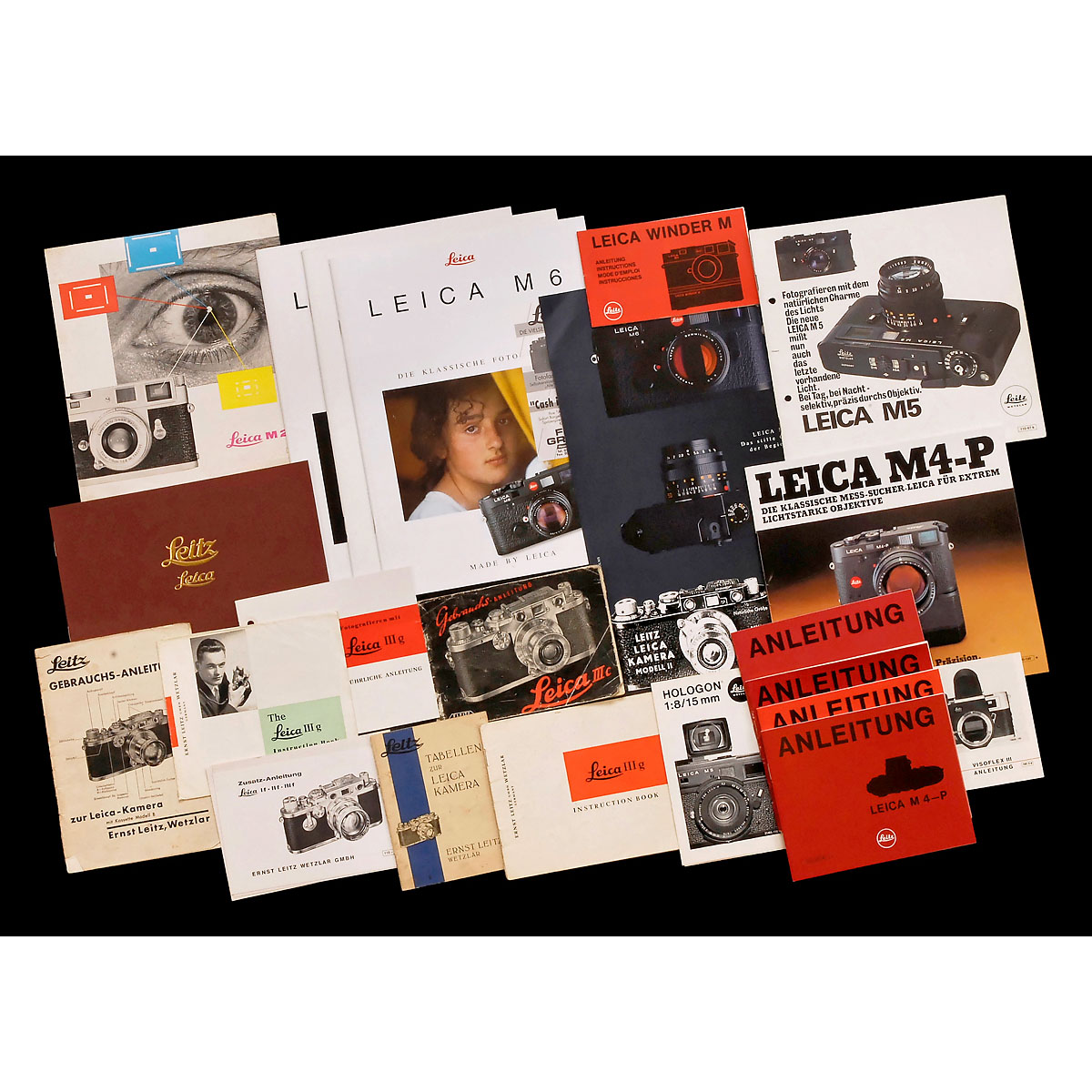 Instructions (Leica M): 2 x M2, 3 x M3, M4, M4-2, M4-P, M5, 2 x M6, CL, CLE, 3 short manuals for M1/2, M2 and MD/M2, Winder M, Visoflex II, Visoflex III, light meters and lenses. - Brochures: M2, M4-P, M5, CL, 6 x M6, Hologon 8/15 mm and more. - Instructions (screw-mount): IIIa, IIIc, 3 x IIIg, other tables and short instructions. - In addition: Brochure "Leica 0-Serie" (replica). - Approx. 53, in German and English language.