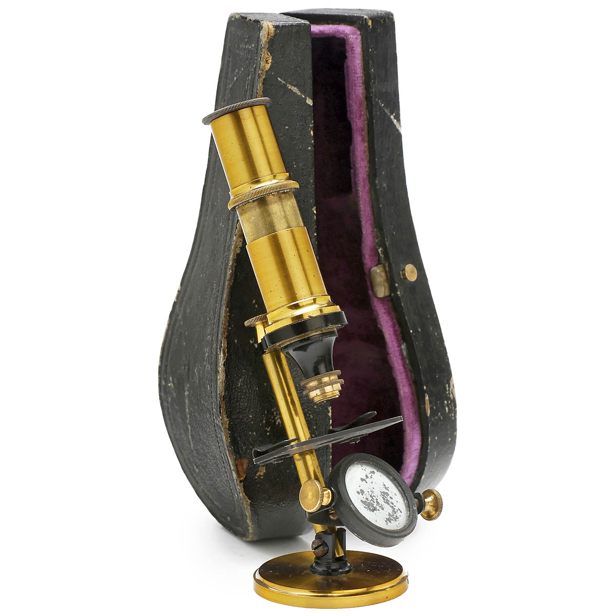 Unmarked, brass tube and stand, height 4 ¾ in., mirror slightly tarnished. With original case.