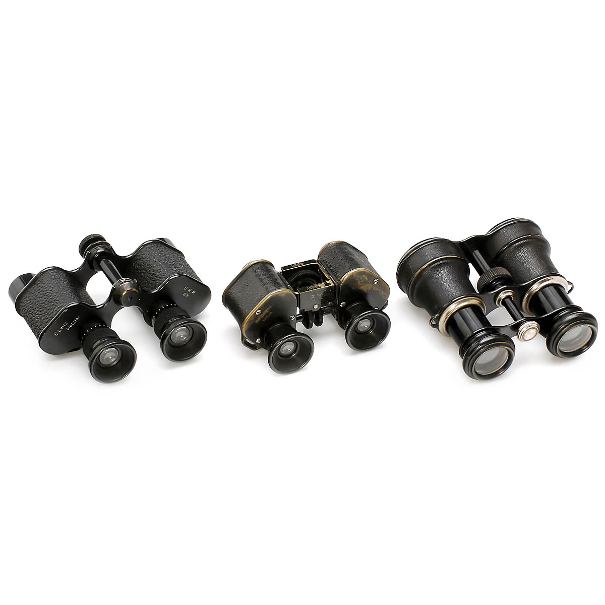 1) E. Leitz, Wetzlar. D.R.P. 6x, with case. - 2) C.P. Goerz, Berlin. Triedler Binocle 3x, no. 6220. - And: 3) French binoculars "Jumelle de Tir", with built-in compass, case.