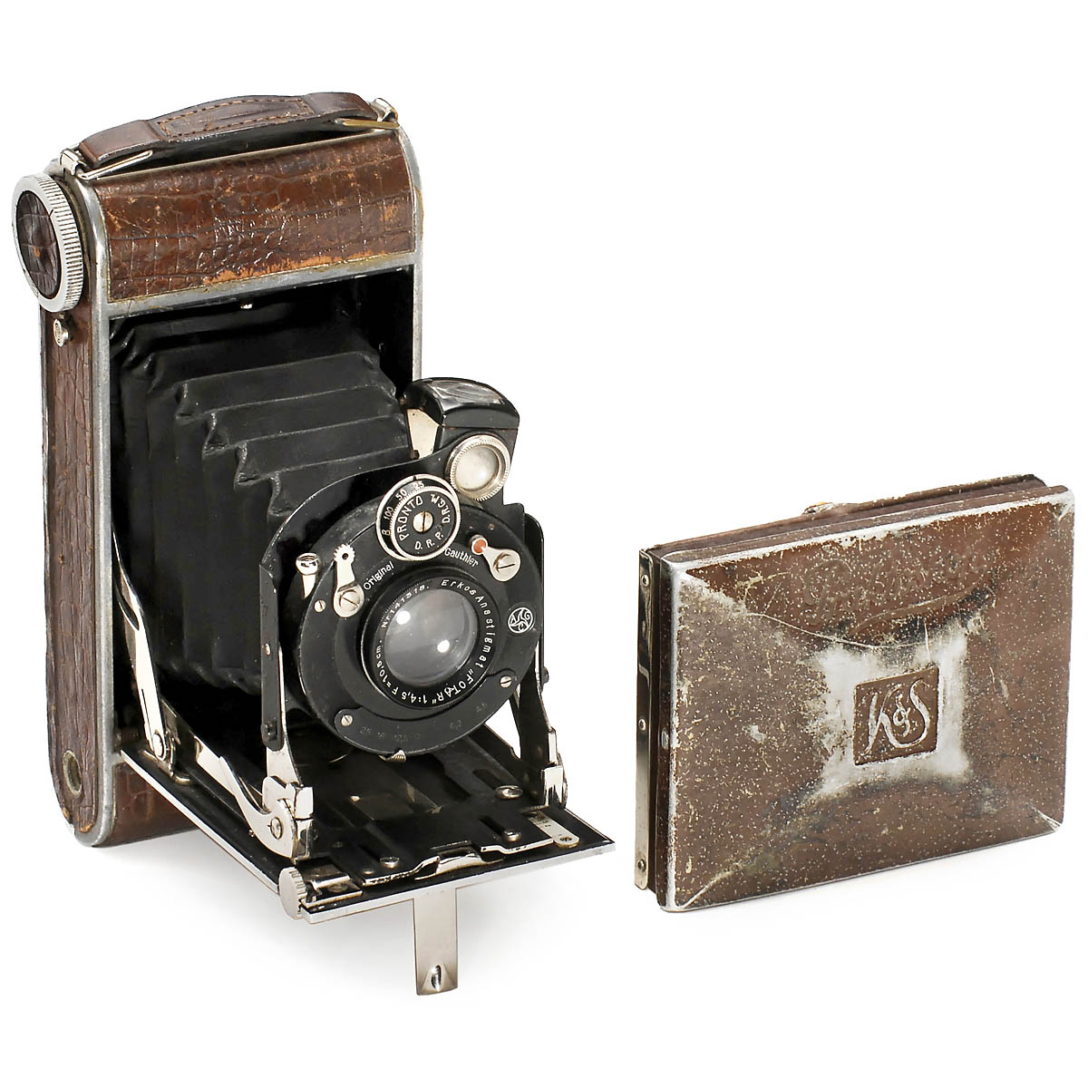 C.F. Foth, Berlin. 6 x 9 cm, Erkos Anastigmat Fotar 4,5/10,5 cm in Pronto. (3-/3-) - In addition: K&S Praktoskop, c. 1910, Kolbe & Schulze in Freital b. Dresden, plate size approx. 6 x 8 cm, Pololyt 4,5/10,5 cm by Laack, field bed missing. (4/5)