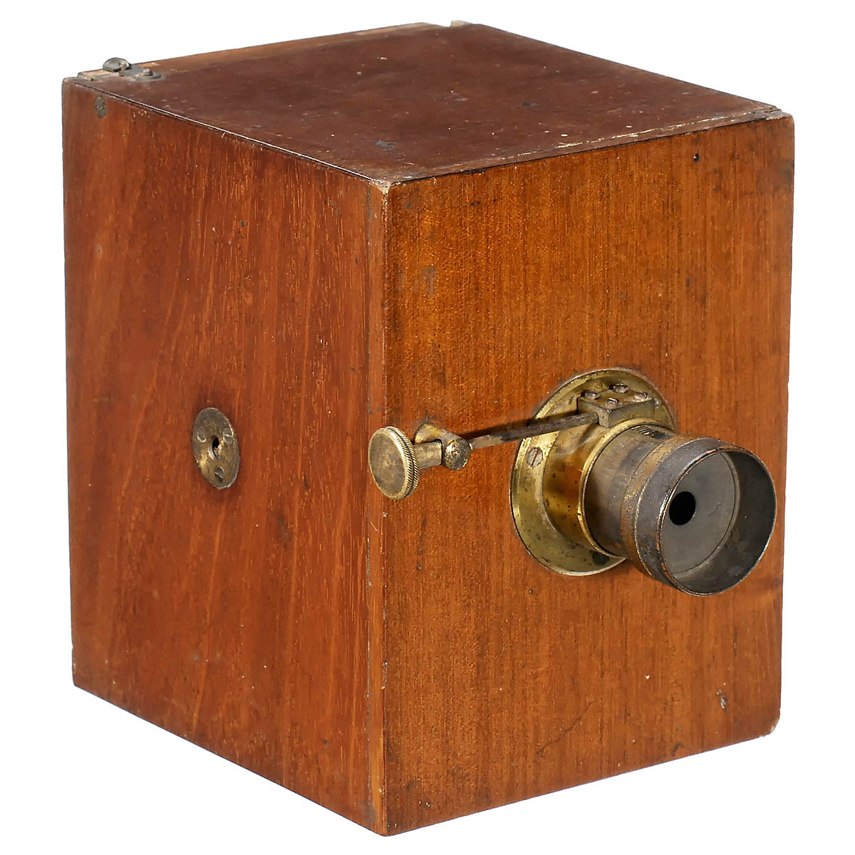 Probably by Étienne Carjat, Paris. French caricaturist, journalist, photographer and designer (1826-1906). Similar to "Le Phoebus" c. 1885, but with larger plate size of 9 x 12 cm, polished wood, unmarked brass lens, focal length approx. 15 cm, rack-and-pinion focusing, focusing screen back. - Rare plate box camera!