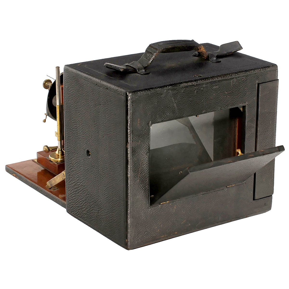 American Optical Co., Scovill & Adams Co., props., version with hinged bed mirror, plate size 5 x 7 in, black leather covering, mahogany body, brass fittings, dark-red bellows, shutter by Prosch-Triplex (not working). Extremely solid construction. - Only produced for 5 years.