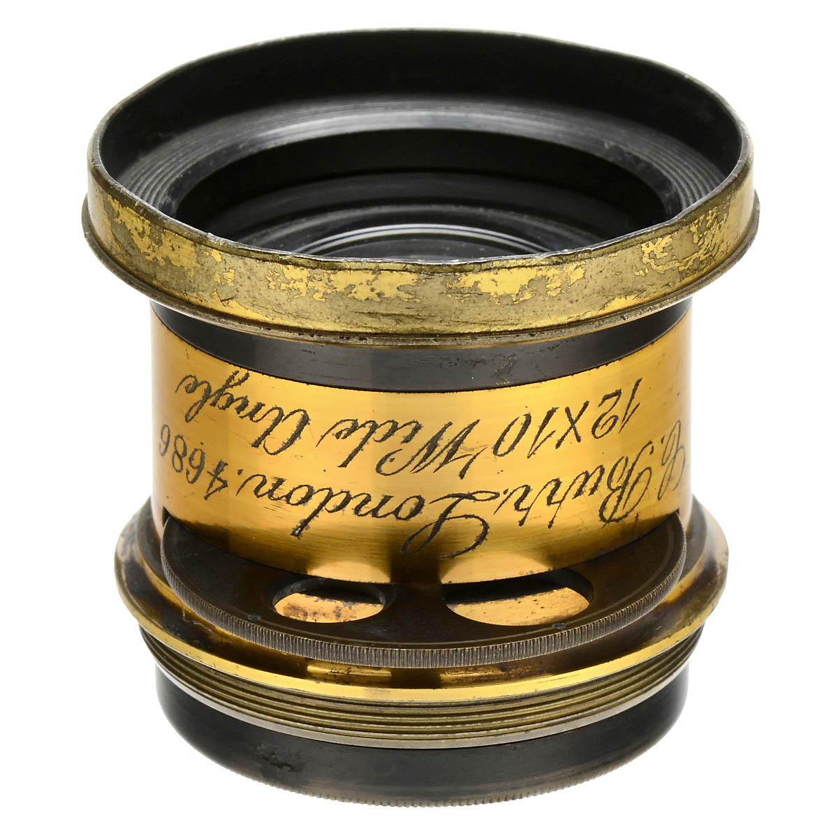 1) R. & J. Beck, London. Wide-angle lens "5 inch W.A. RechtR", c. 1875. Approx. 13 cm focal length, rotating stop, heigth 3 cm, Ø 4,5 cm, connecting ring Ø 7 cm, sold by W.H. Walmsley & Co., "Sole American Agents", no. 1842. - 2) Taylor & Hobson. Wide-angle lens "12 x 10", c. 1890. No. 3719, probably based on the first "Cooke Lens" construction. Focal length approx. 18 cm, iris stop F16-F64, height 1 3/5 in., front lens Ø 1 ½ in. (3-/3-) - 3) Levi & Co. "The European Lens", c. 1860, Petzval-type portrait lens with one waterhouse stop, focal length approx. 15 cm, height approx. 1 2/5 in., rack-and-pinion focusing, with leather lens cap. (3-/3) - 4) C. Burr, London. Wide-angle lens "12 x 10 Wide Angle", no. 4686, c. 1875. Rotating stop, height 2 in., Ø 1 ¾ in. (3/3) - And: 5) C. Burr, London. "10 x 8 Rapid Doublet", c. 1886. "Sold by R. Abraham, 22 Charterhouse Buildings, London." No. 4668, for waterhouse stop, height 3 1/6 in., Ø 2 1/3 in., connecting ring Ø 3 1/6 in. (3/3)