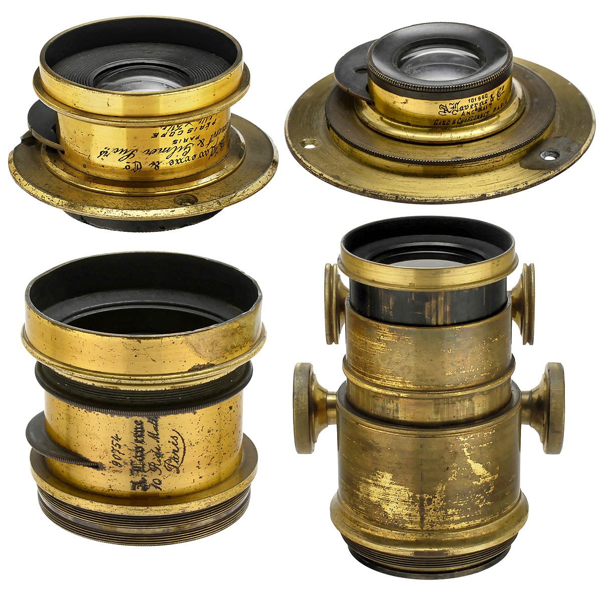 1) "A. Laverne & Co., Clément & Gilmer Sucrs Paris". Wide-angle "Periscope 4 ¼ x 3 ¼", c. 1887, approx. 8 cm focal length, lens Ø 2/3 in., height 1 1/5 in., connecting ring Ø 1 2/3 in., rotating stop. (2/2) - 2-3) 2 wide-angle lenses by Laverne & Co. (Gasc & Charconnet), c. 1887-1890. Wide-angle lens, no. 101550, rotating stop, height ¾ in., Ø 1 3/5 in., connecting ring Ø 2 ½ in. - Wide-angle lens, no. 90754, with approx. 17 cm focal length, rotating stop, height 2 1/3 in., Ø 2 1/3 in. (2-3/2-3) - And: 4) Caterpillar projection lens, c. 1899, unmarked, engravings: 12, 15, 18, 20 and on the brass rims 9 and 12, rack-and-pinion focusing, height 5 ½ in., screw-mount Ø approx. 2 2/3 in.