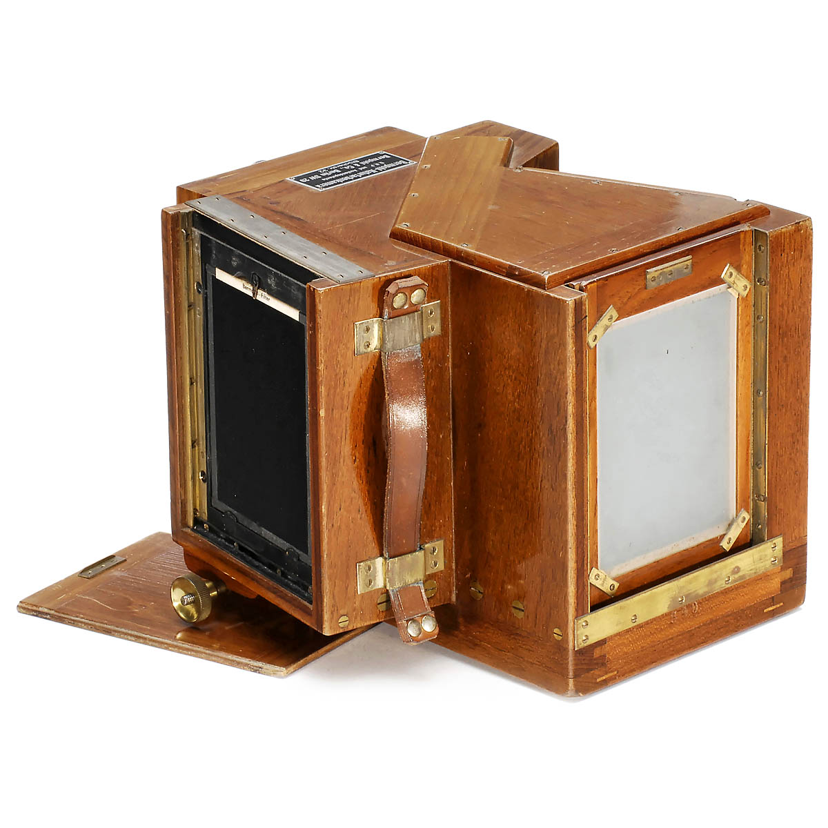 Bermpohl & Co., Berlin. Very low serial no. 540, size 9 x 12 cm, tropical wood with brass fittings, with Doppel Plasmat 1:4/21,5 cm, no. 962132, light brown bellows, with original filters: green/red/blue and 2 filter sets of red/blue more. - An impressive and important collector's item and exhibition piece!