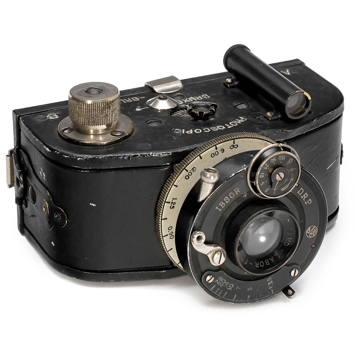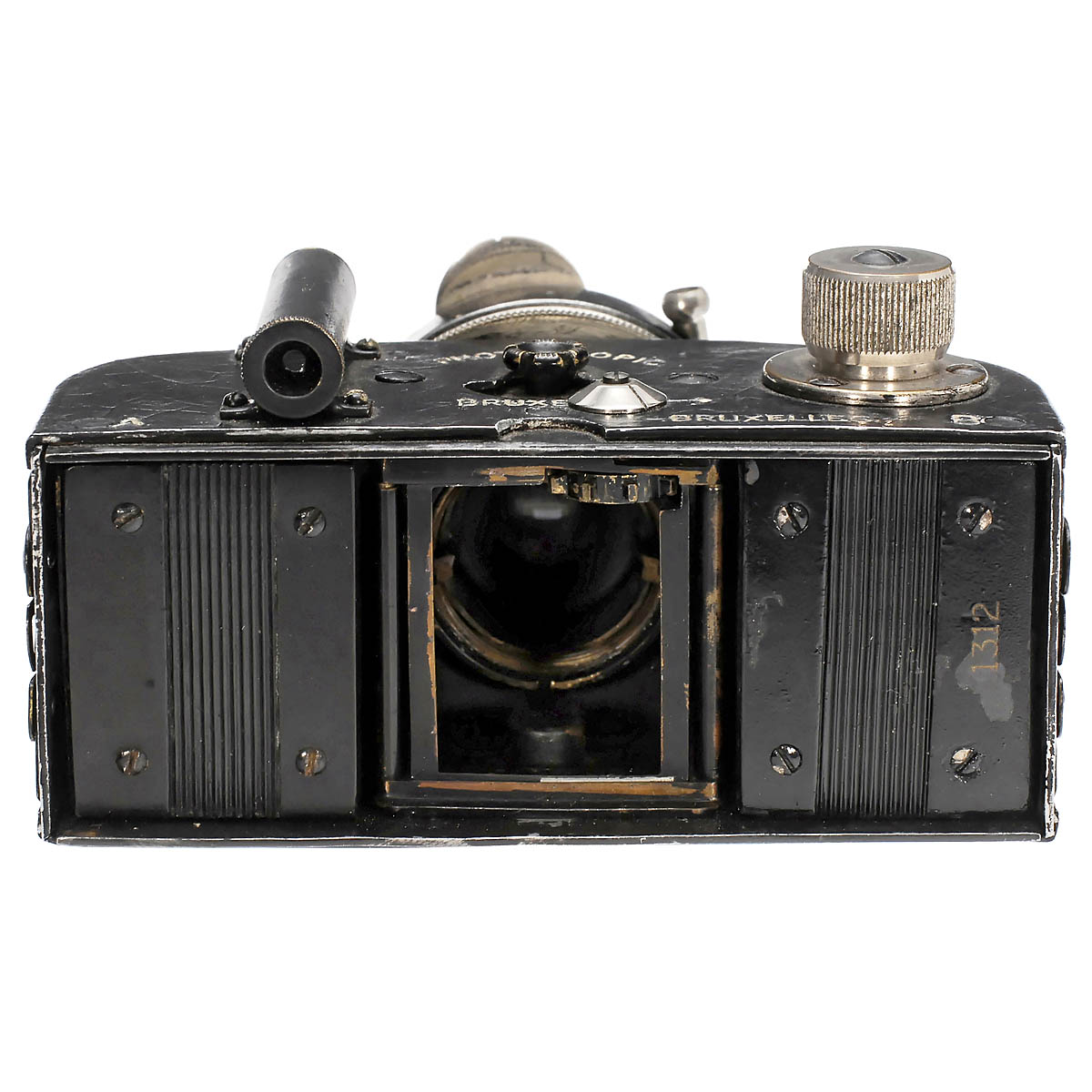 La Cinescopie, Brussels, Belgium. No. 4405, second version with winding knob, size 22 x 30 mm on 35mm film, for 50 exposures in special cassettes, 2 cassettes inside, with O.I.P Gand-Labor 3,5/45 mm in Ibsor shutter, full focusing (helical focusing). - Very rare and attractive Leica competitor. - Good condition!