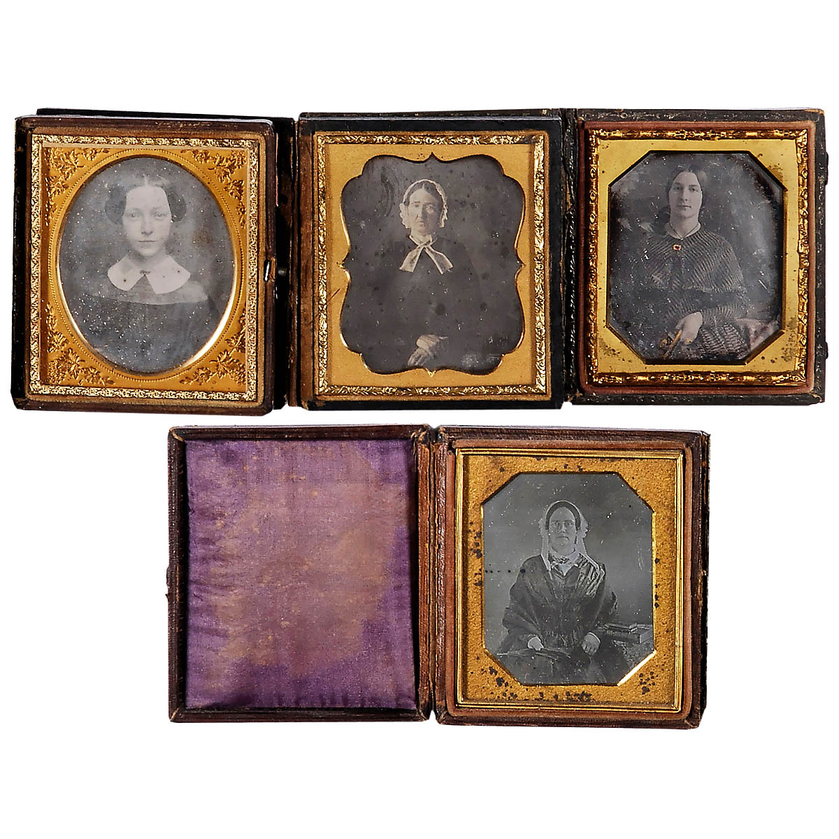 Anonymous. 4 portraits of ladies, 3 lightly hand-tinted daguerreotypes, cases with covers (1 x spine loose), brass passe-partouts.