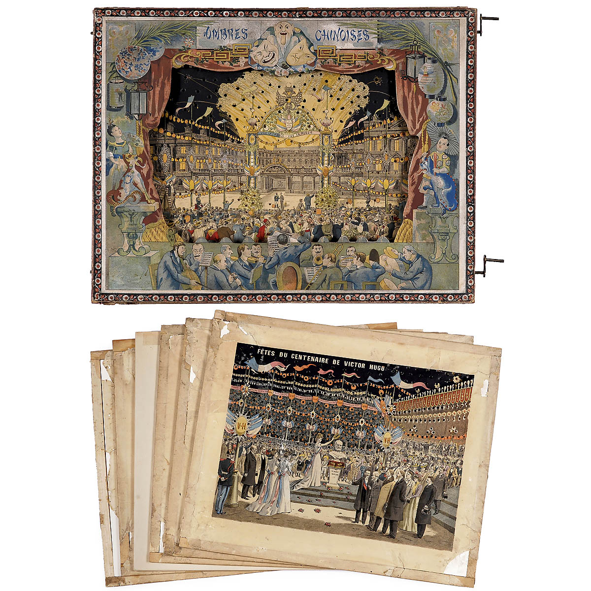 Mauclair Dacier, Paris. Composed of front gate and 7 metamorphic day/night scenes of 15 x 19 1/3 in. Completely restored in 1995, façade original, back new. Pictured in "Magie Lumineuse", p. 265.