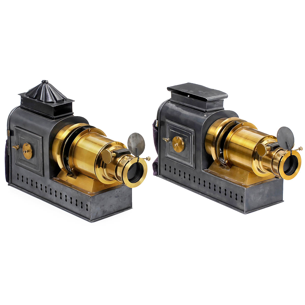 E. Leybold's Nachfolger, Cöln a. Rh. Magic lantern, order no. 2489 in maker's catalog, with 2 brass lenses, "Trade Mark London Made 7 in." (180 mm focal length), for strips or lantern slides of 8 x 8 cm (3 1/6 x 3 1/6 in.), height of the projectors 11 ¾ in., lens with rack-and-pinion focusing, electrification. - Ideal for a dissolve show!