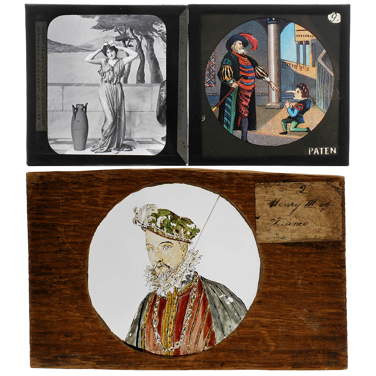 A. Molteni, Paris. Rare large magic lantern for slides of 12 cm (4 ¾ in.), with one hand-painted glass slide "Henry III of France" (cracked). Original wooden box, lens and burner with cylinder, height with chimney 38 1/5 in. (!), length 15 ¾ in. - Literature: "Du Soleil Au Xenon", p. 21.
