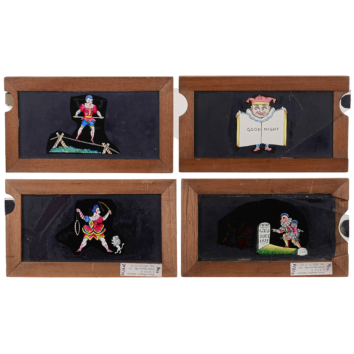 4 Magic Lantern Single Rackwork Slides of Clowns, 1860 onwards