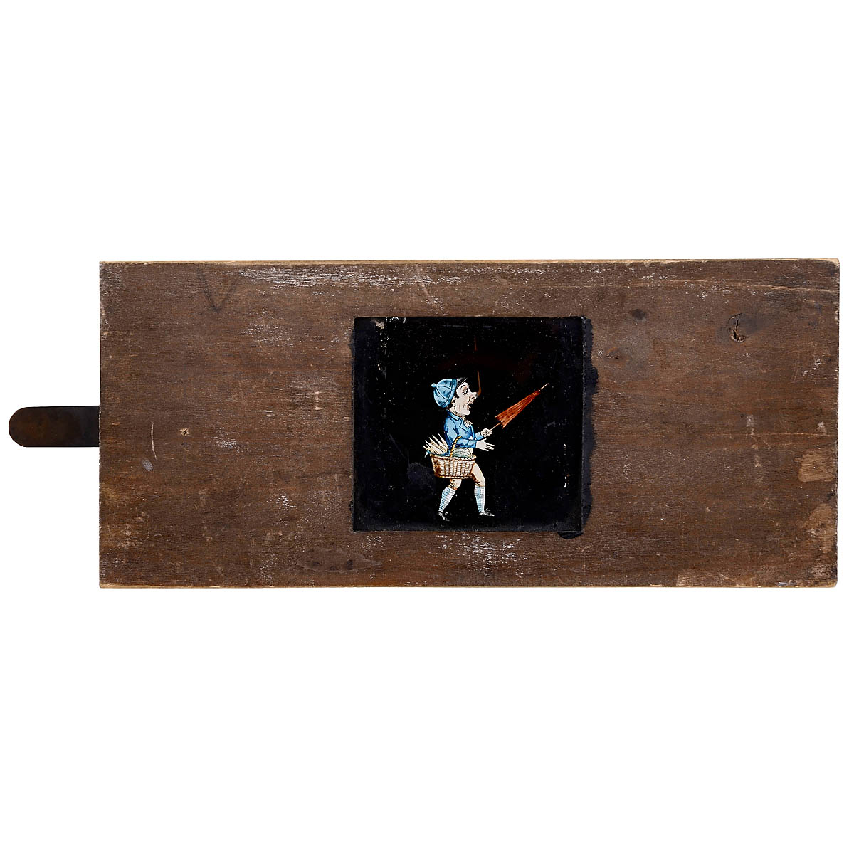 Early rackwork slide in wood frame 4 1/3 x 10 in., picture size 3 1/6 x 3 1/6 in., man with vegetable basket and umbrella, hand-painted, excellent condition!