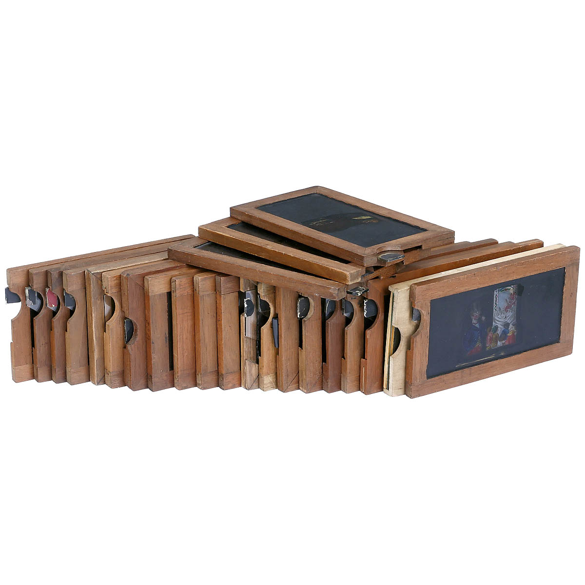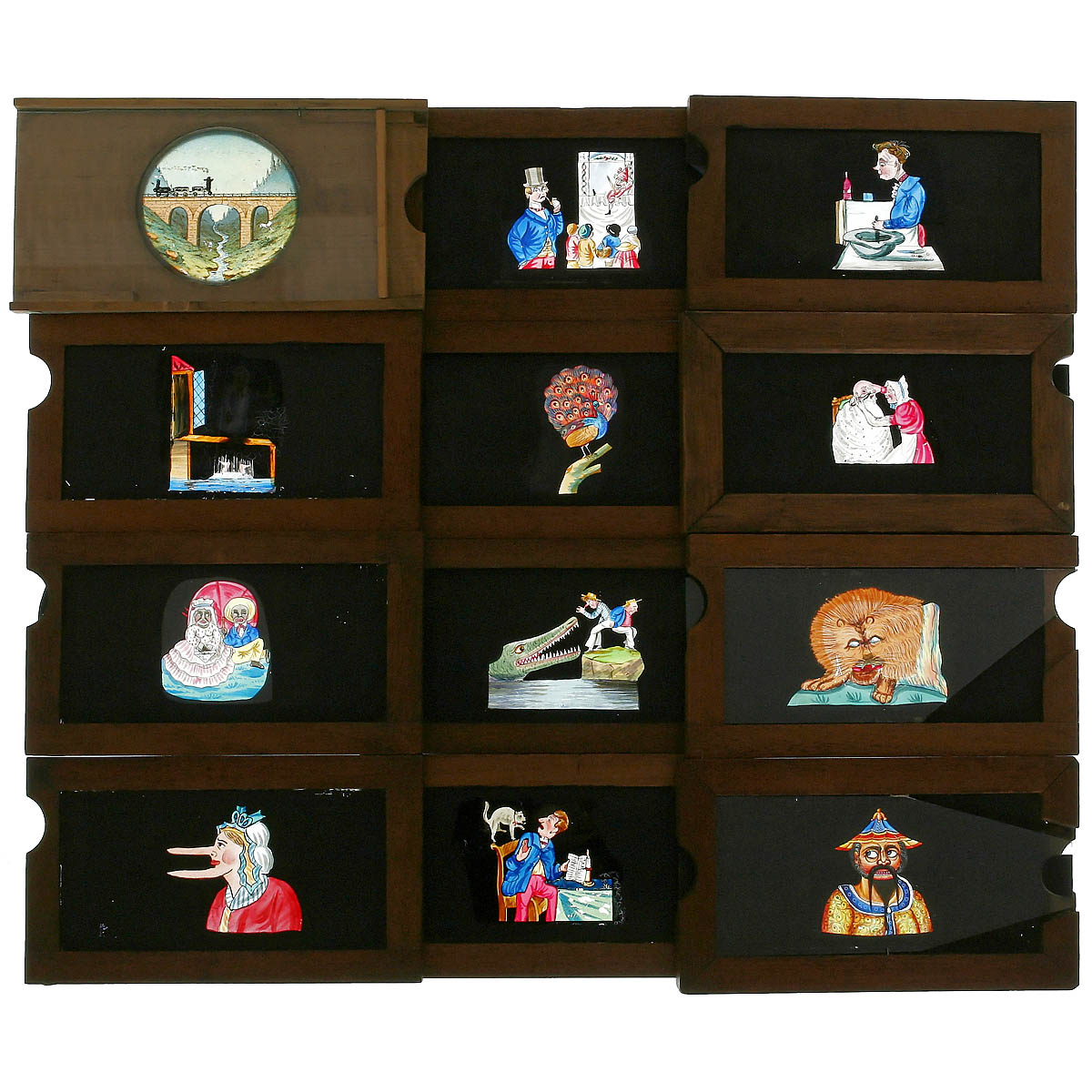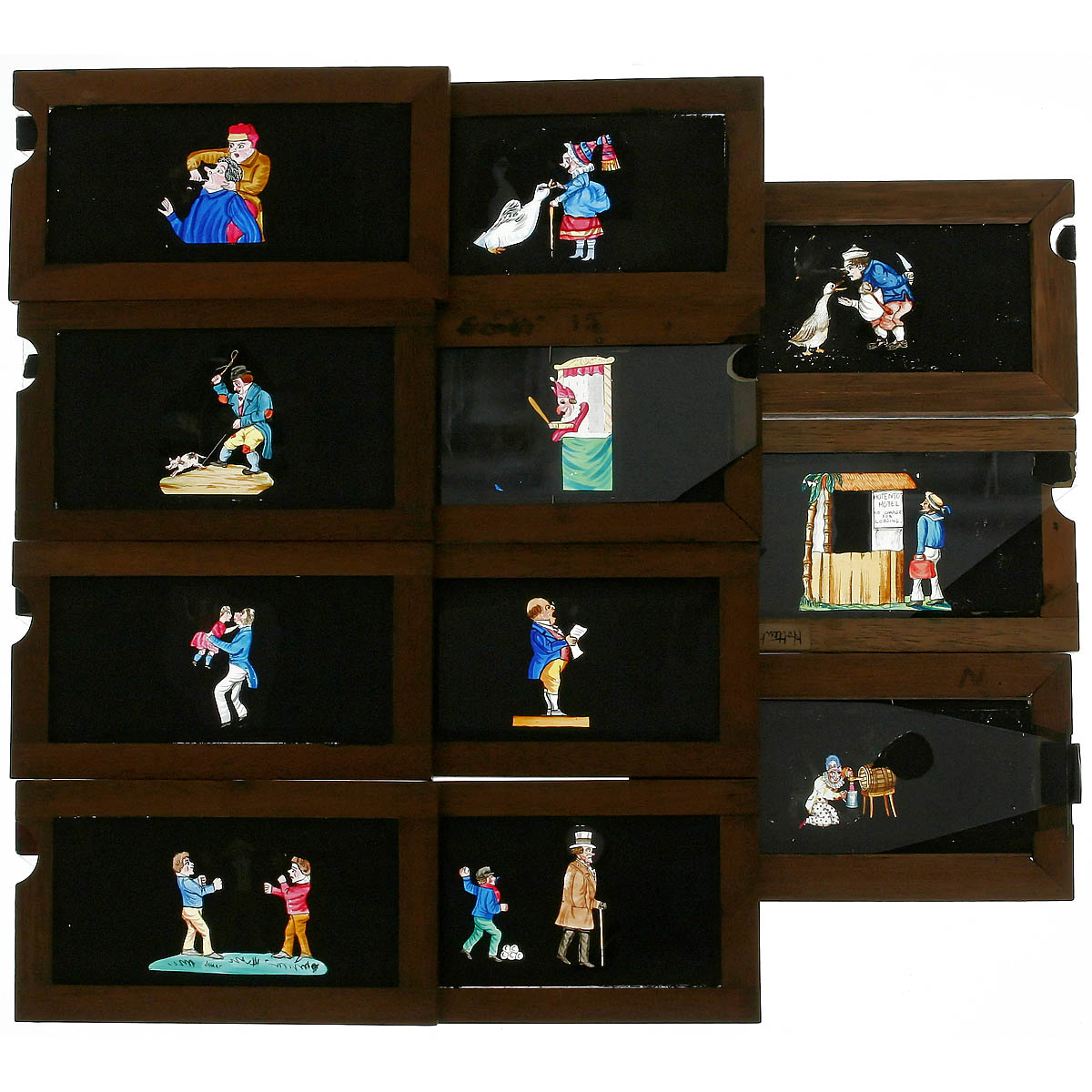 England, good-quality hand-colored slides with amusing motifs in teakwood frames. - In addition: A single rackwork slide 4 x 7 in. from 1900. - Provenance: Hansen Collection. - All images available online.