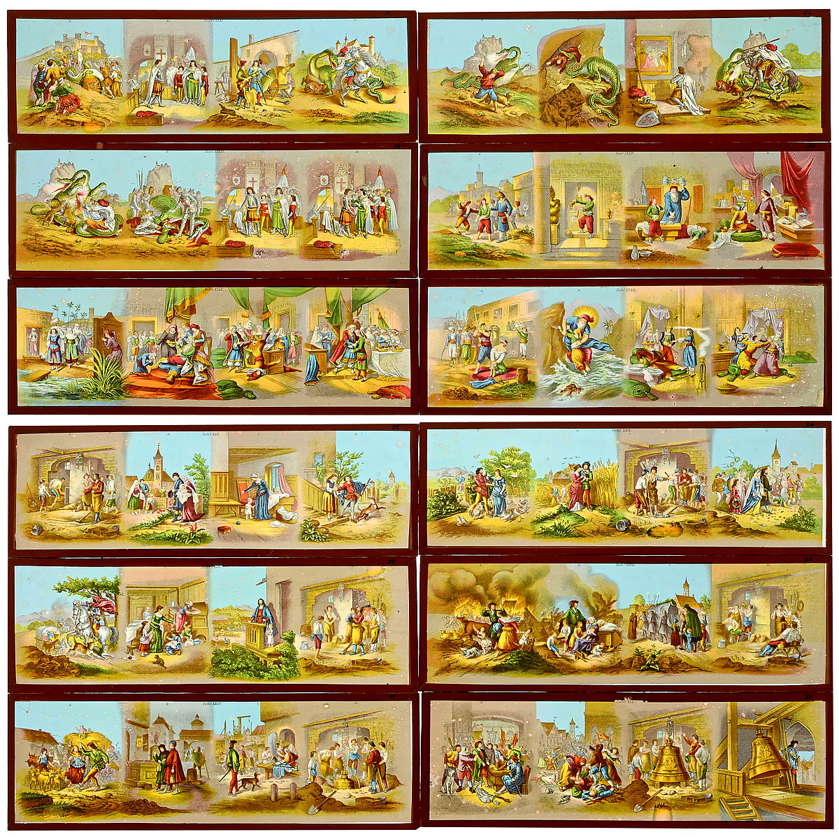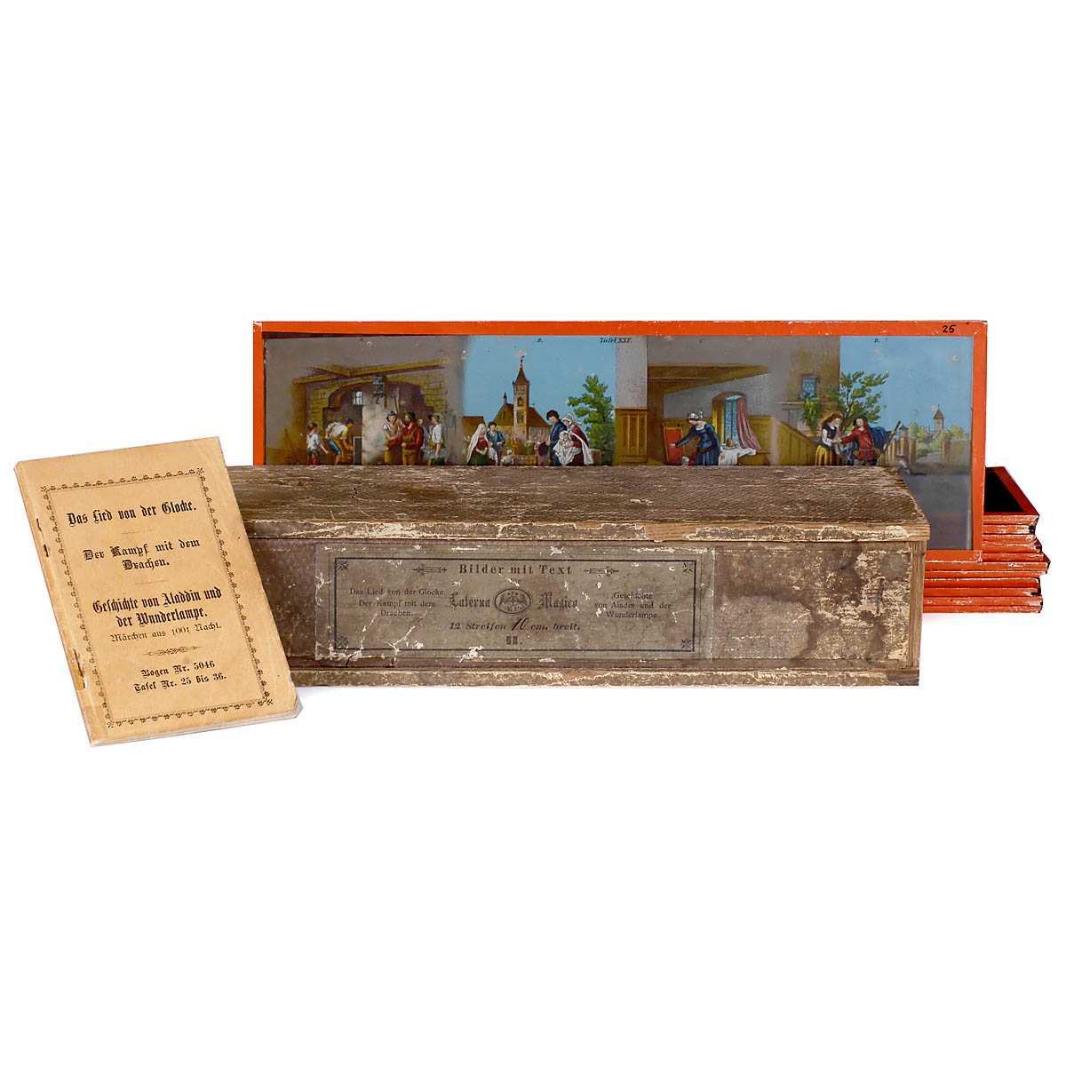 Ernst Plank, Nürnberg. Size 4 x 11 3/4 in. Complete series by E.P. "Tafel Nr. 25-36": "Das Lied von der Glocke", "Der Kampf mit dem Drachen", "Geschichte von Aladdin und der Wunderlampe", with original lyrics and wood box.