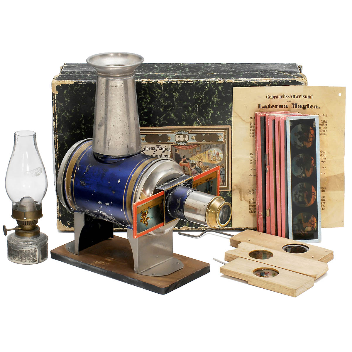 Jean Schoenner, Nürnberg. Also retailed by Carl Müller, Vienna. Produced in 7 sizes, this version for lantern slides of 1 ½ in. (4 cm). Cylindrical tinplate body on wood base, translucent blue lacquer. With original lens, burner and chimney, height of the lantern 10 in. With box, 3 mechanical and 12 strip slides. - In addition: Supplementary sheet of instruction.