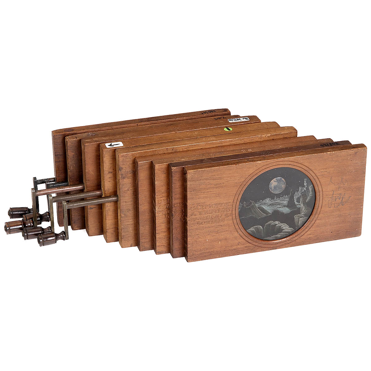 1-3) Carpenter & Wesley, London, c. 1890. 3 mechanical rackwork slides: "The Solar System …", "The Earth Annual Motion …" and "The Cause of Spring & Neap Tides …". Mahogany frames 4 x 7 in. (10 x 18 cm). - Very rare. - 4-5) 2 rackwork slides by W. & F. Newton, London, c. 1850: 2 ships circle the earth. Day and night of the earth. - And: 6-9) 4 mahogany frames, size 4 x 6 4/5 in. (10 x 17,5 cm) by Carpenter & Westley, London: 2 x zodiacal signs and 2 x earth-and-moon views. - All lantern slides in excellent condition!