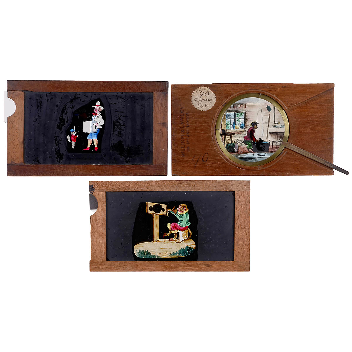 Teak frame of 4 x 7 in. (10 x 18 cm), single slipping slide, marked "Millikin & Lawley London". 2 single rackwork slides, not marked. - All slides hand-colored. Attractive series!