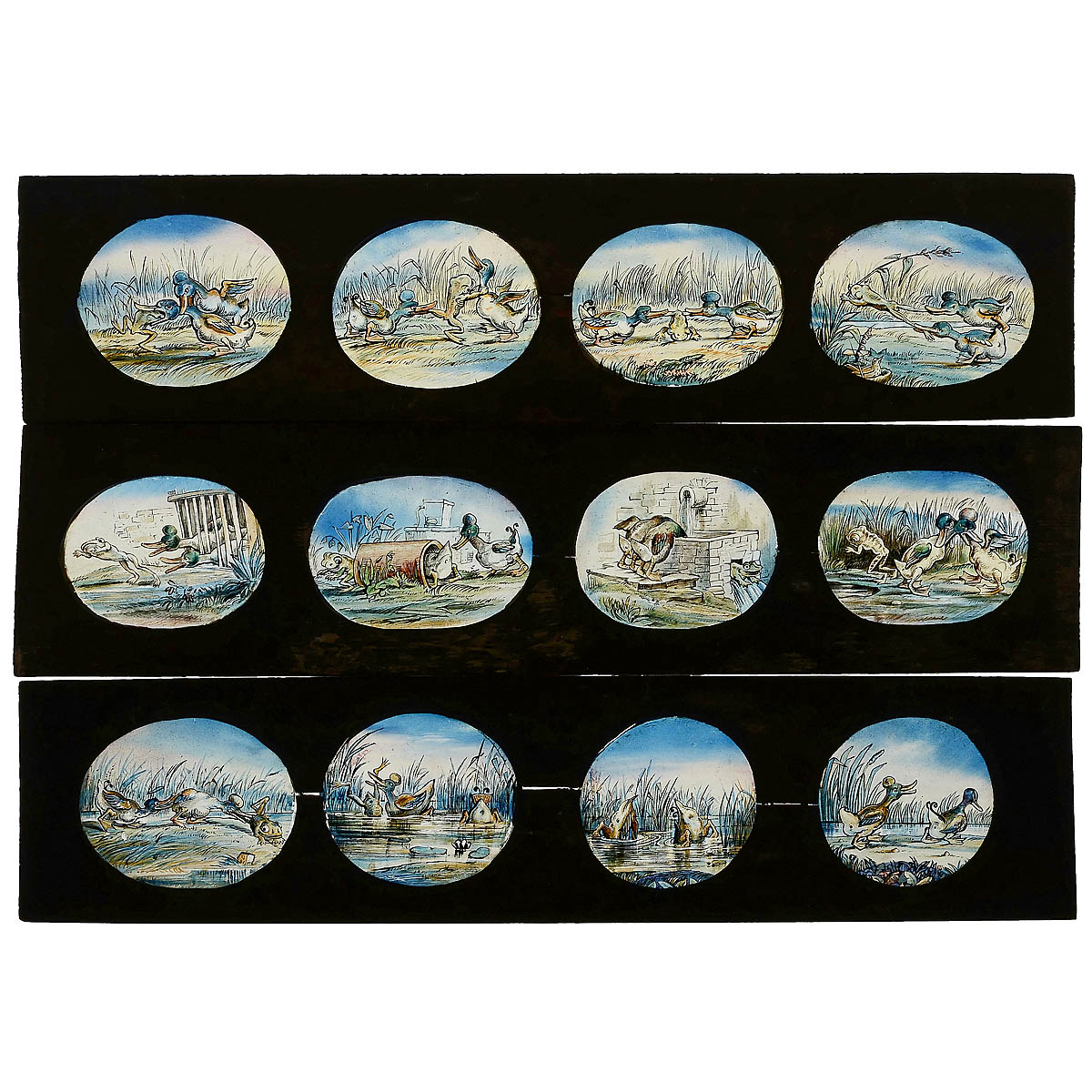 Series of 3 magic lantern wood-framed slides, "Die beiden Enten und der Frosch" ("The two ducks and the frog") by Wilhelm Busch, framed size 4 x 16 ½ in. (10 x 42 cm), various picture sizes, hand-mounted. - Very beautiful series and very rare!