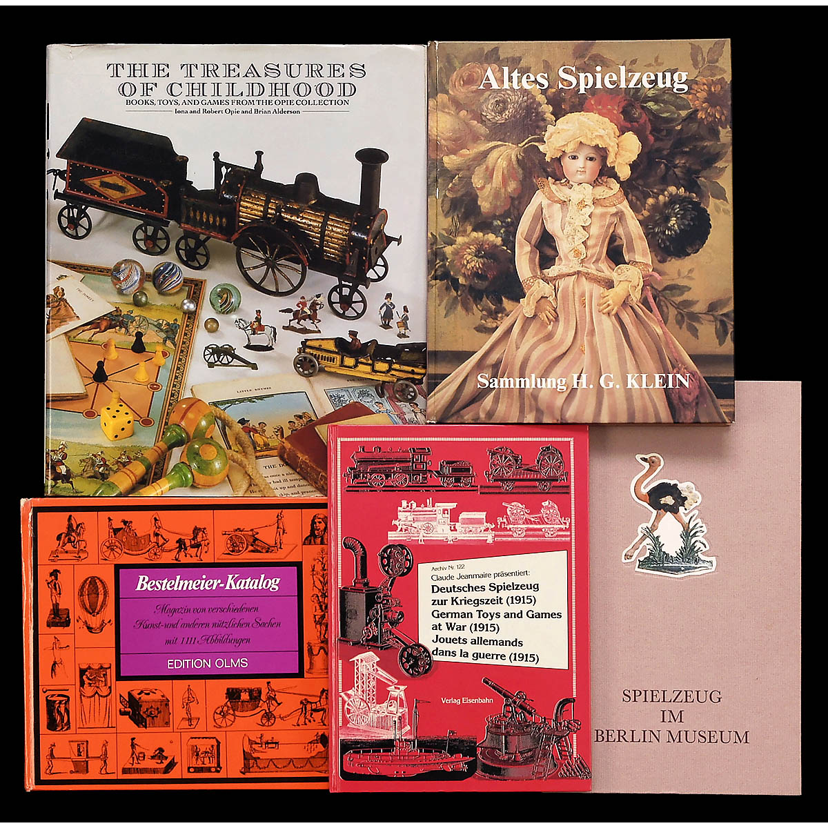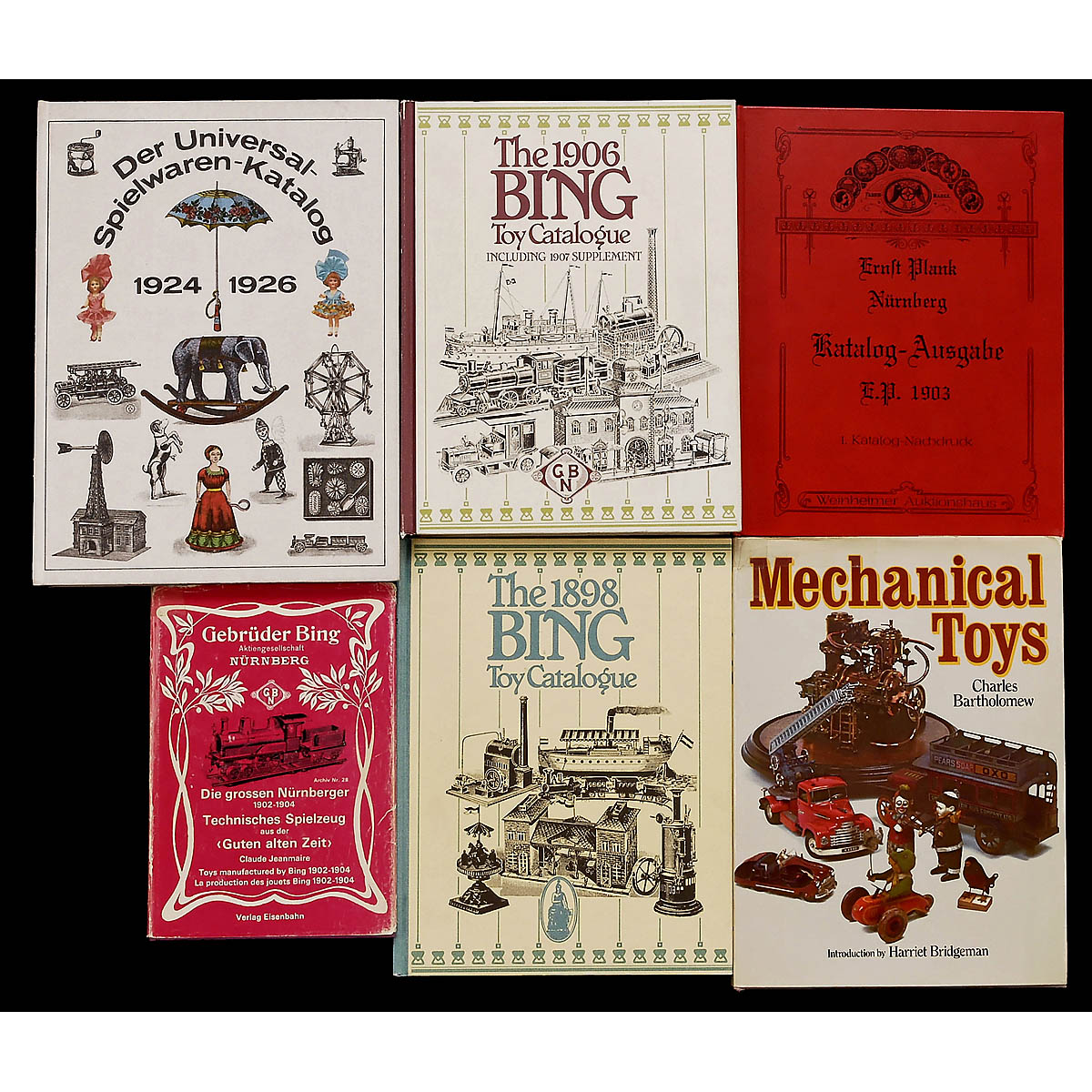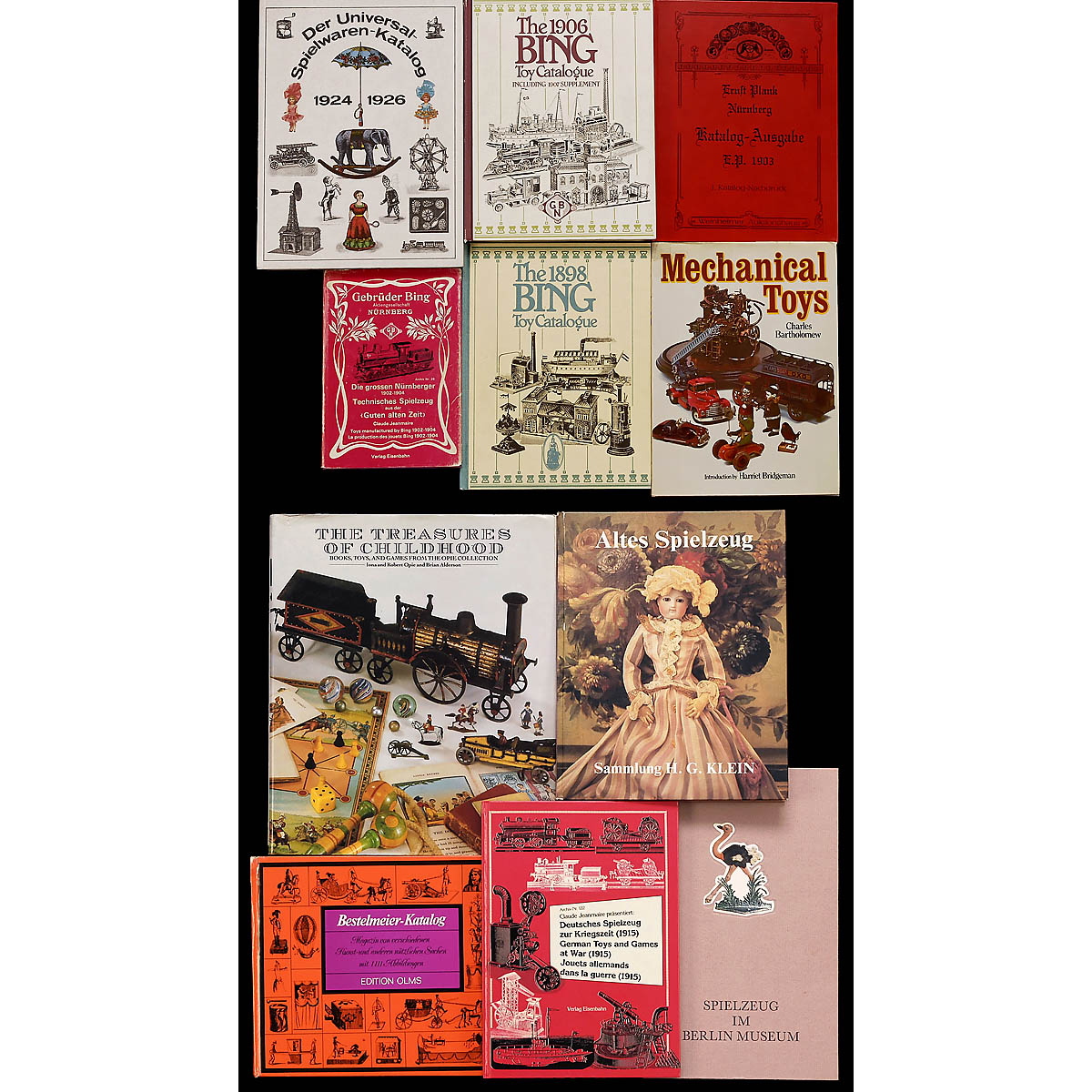 11 catalogs: Tin-toys, dolls, magic lanterns, optical toys and more: 1) The 1898 Bing Toy Catalogue, reprint. - 2) The 1906 Bing Toy Catalogue, reprint. - 3) Der Universal-Spielwaren-Katalog 1924-1926, reprint. - 4) Ernst Plank, Katalog-Ausgabe 1903, reprint. - 5) Claude Jeanmaire, "Deutsches Spielzeug zur Kriegszeit (1915)". - 6) Gebrüder Bing, "Die grossen Nürnberger 1902-1904". - 7) Charles Bartholomew, "Mechanical Toys". - 8) Sammlung H.G. Klein, "Altes Spielzeug". - 9) Bestelmeier-Katalog. - 10) Iona and Robert Opie, "The Treasures of Childhood". - And: 11) "Spielzeug im Berliner Museum".