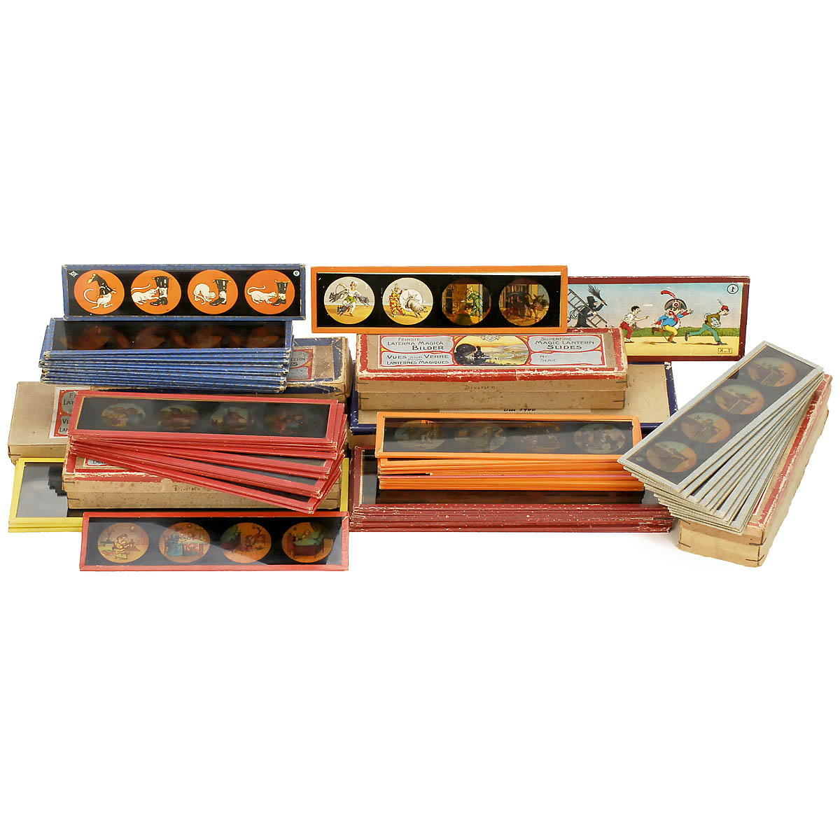 Gebrüder Bing, Nuremberg. 1-4) 4 boxes, each with 12 glass slides, size 5 x 18 cm (2 x 7 in.), amusing motifs for children. - And: 5) 1 complete series of 12 lantern slides "Künstlerserie No. 1", size 7 x 23 cm (2 ¾ x 9 in.) and 3 additional monochrome photographic lantern slides.