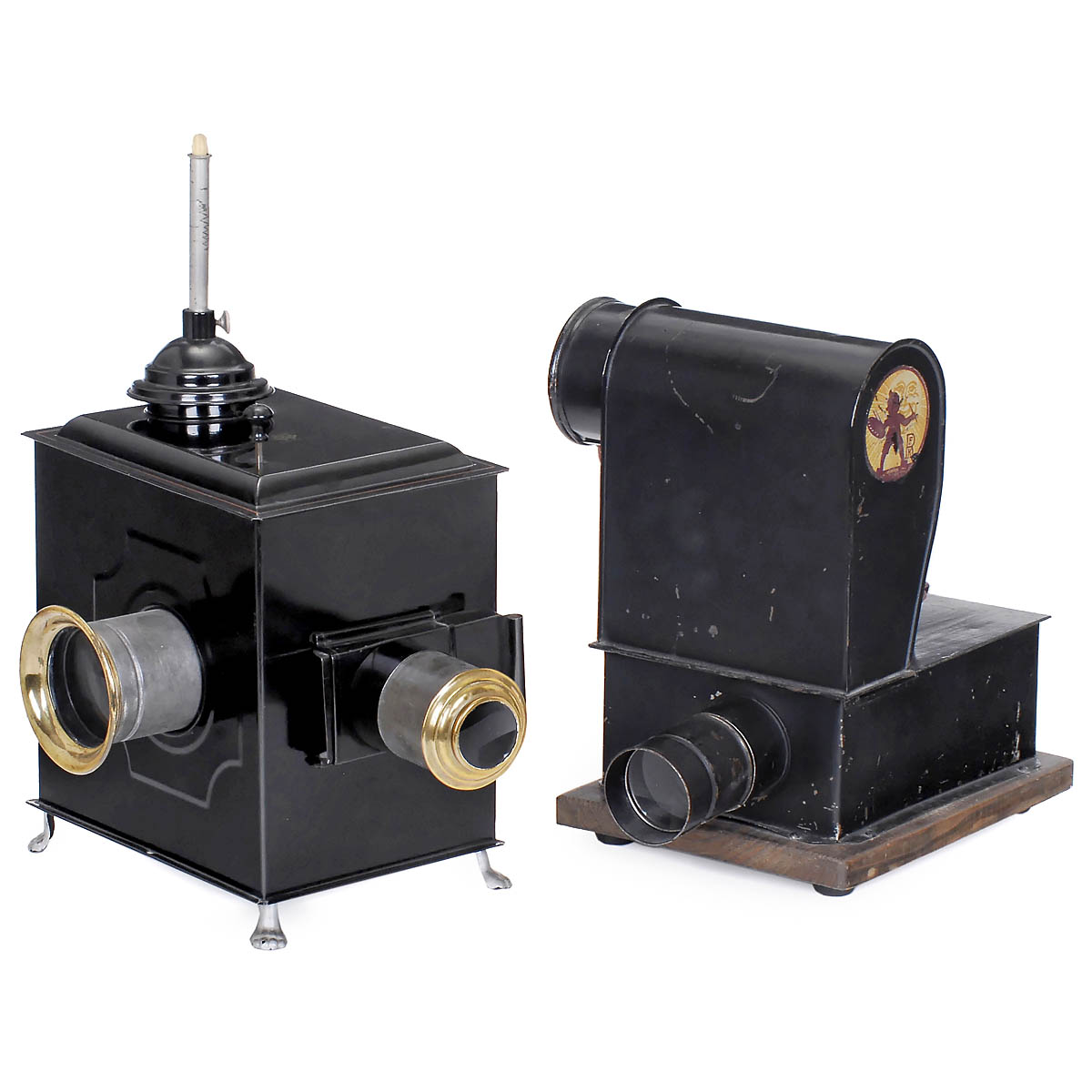 1) Bing, Nürnberg. Megascop (Phänomen), c. 1925, black-lacquered metal body, height 8 3/4 in., for lantern slides with height of 2 1/3 in. and postcards with length of 3 ½ in., original electrification by Bing. (2/-) - And: 2) Black-lacquered magic lantern on wood board, marked "FK", for lantern slides of 1 3/4 in., horizontal placement, electrification. Rare projector. (3/-)