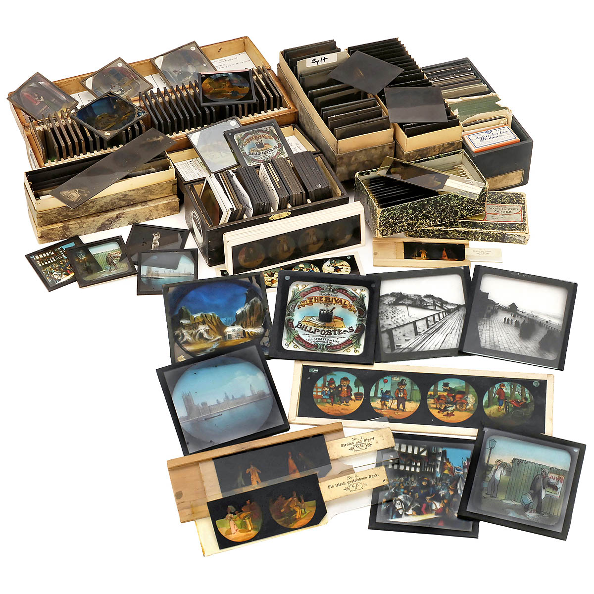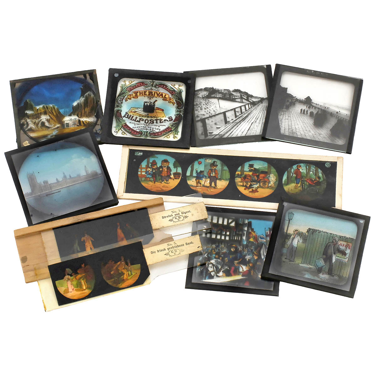Various sizes and subjects. One box by Gebr. Bing with 12 "Komische Verwandlungsbilder" (funny transformation motifs) with wood frame (size 5 x 13 cm), c. 1906. One box with 10 lantern strips, size 6 x 21 cm, marked "Phänomen". Another box, black-and-white strips, 5 x 21 cm, "Schneewittchen" (Snow White) and "Der gestiefelte Kater" (puss in boots). 2 boxes "Projektion für Alle", 8 x 8,5 cm (one script "Sylt"), not complete. - And: 3 wood boxes with lantern slides of 8 x 8 cm, predominantly color, some slides hand-colored, including small series by Jane Conquest.