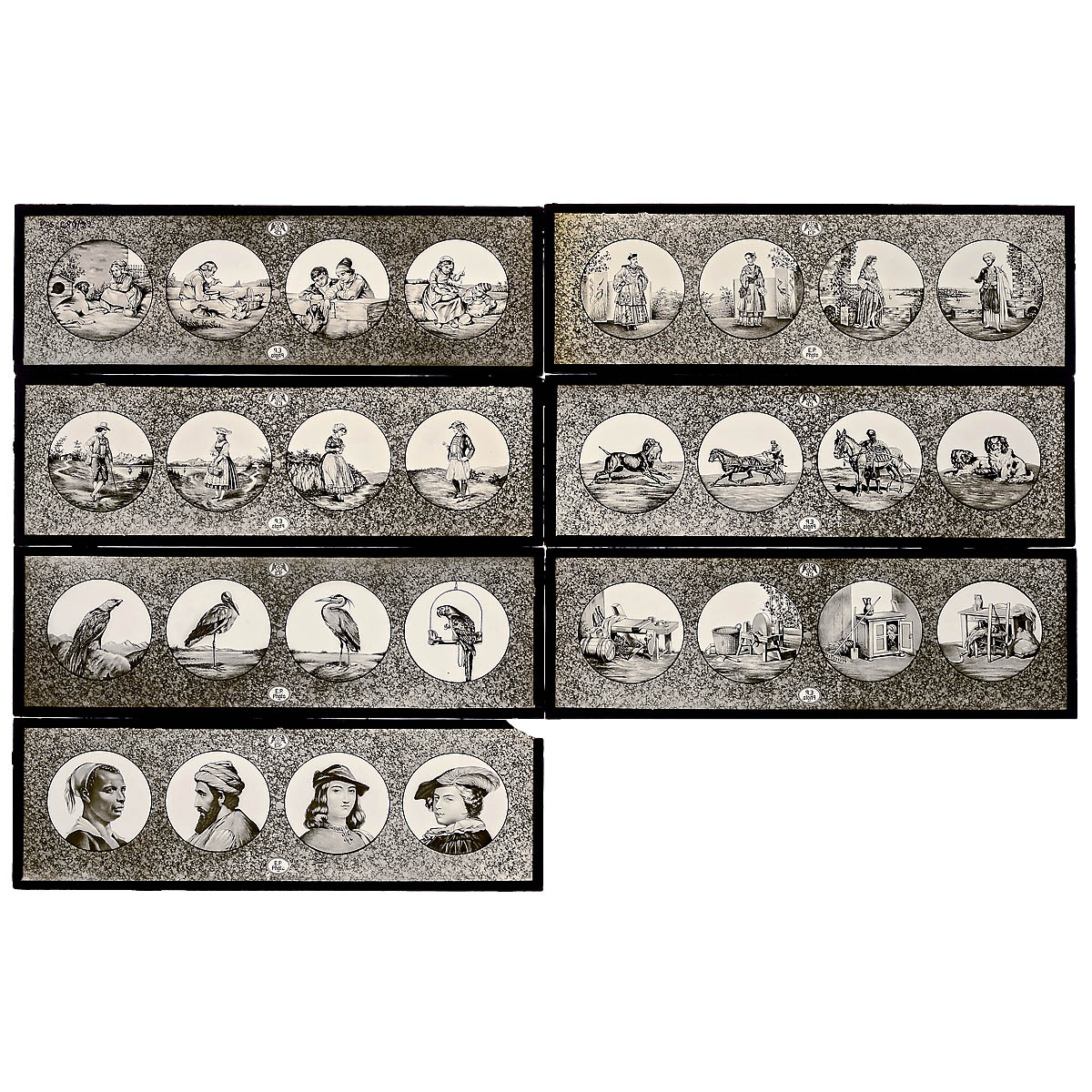 Ernst Plank, Nürnberg. Size 4 x 11 3/4 in. (10 x 30 cm), black-and-white, 7 panorama slides with 4 drawings each. Motifs: Animals, trades, costumes and characters. 2 glass covers cracked. Slides from E.P. series 5000 and 5001 in 1903 catalog. - Rare in this size!