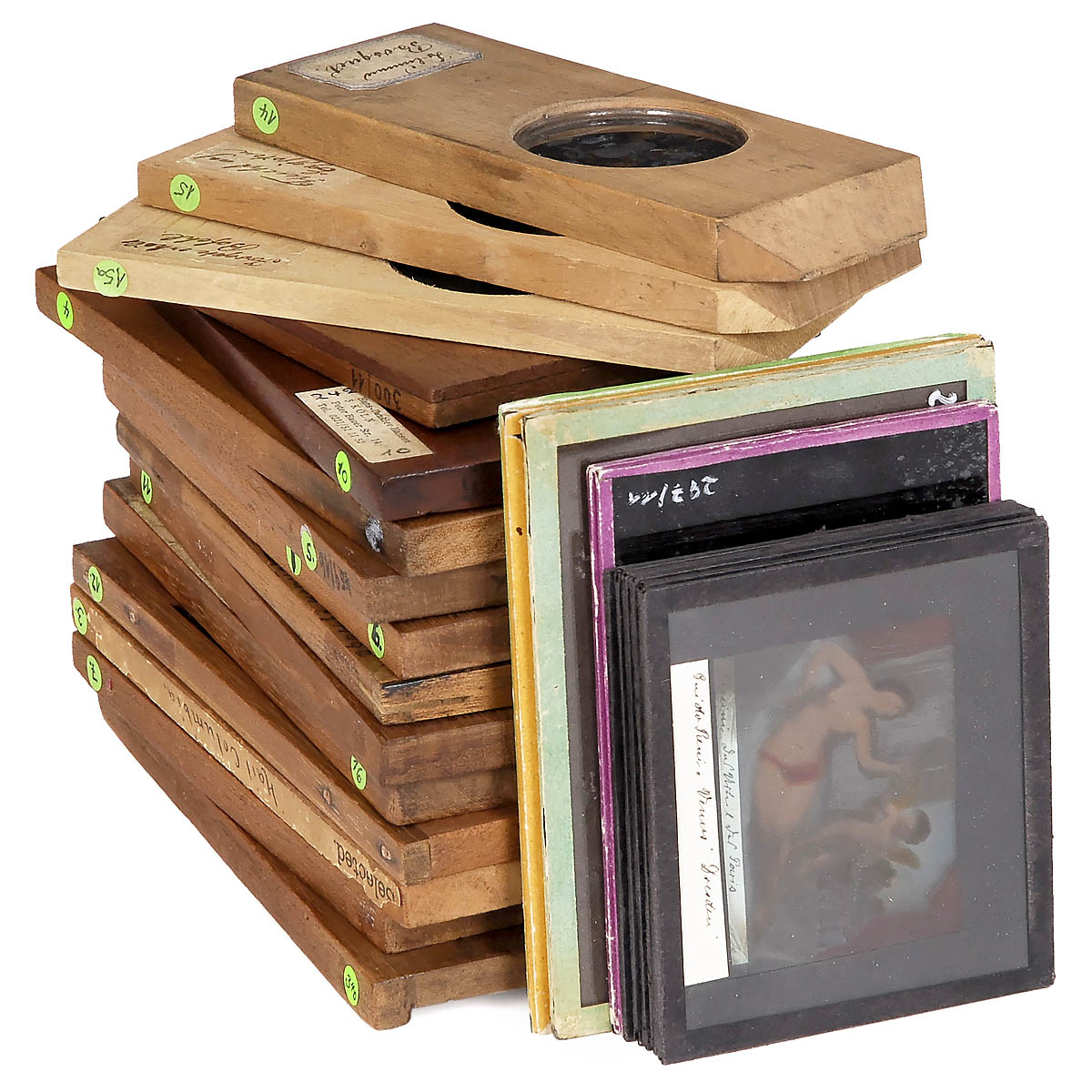 Predominantly from England. 1) Wood frame 4 x 7 in., "American railway night", hand-painted. - 2) Wood frame 4 x 7 in., high-wheel rider, print (hand-colored). - 3) Wood frame 4 x 7 in. (glass picture 3 1/6 x 3 1/6 in.), black-and-white slide "Princess Alexandra". - 4) Wood frame 4 ¼ x 6 ½ in., flight of steps with figures. - 5) Wood frame 3 ¾ x 6 2/3 in., "Opening of the New London Bridge" (Tower Bridge). - 6) Wood frame 3 ¾ x 6 ¾ in., "The Village of Haerlaem" by Cox, London. - 7-9) 3 small wood frames 2 1/3 x 6 in. and 2 ¾ x 6 in. - 10) Wood frame 4 1/3 x 7 in. (glass picture 3 1/6 x 3 1/6 in.), devil. - 11-14) 4 wood frames 4 x 6 ¾ in. - 15) Small lantern picture, wood frame 4 x 5 in. - And: 16-26) 11 lantern slides with size 3 ½ x 4 in., 3 ½ x 4 ¾ in. and 4 x 5 in. - Worth a look!