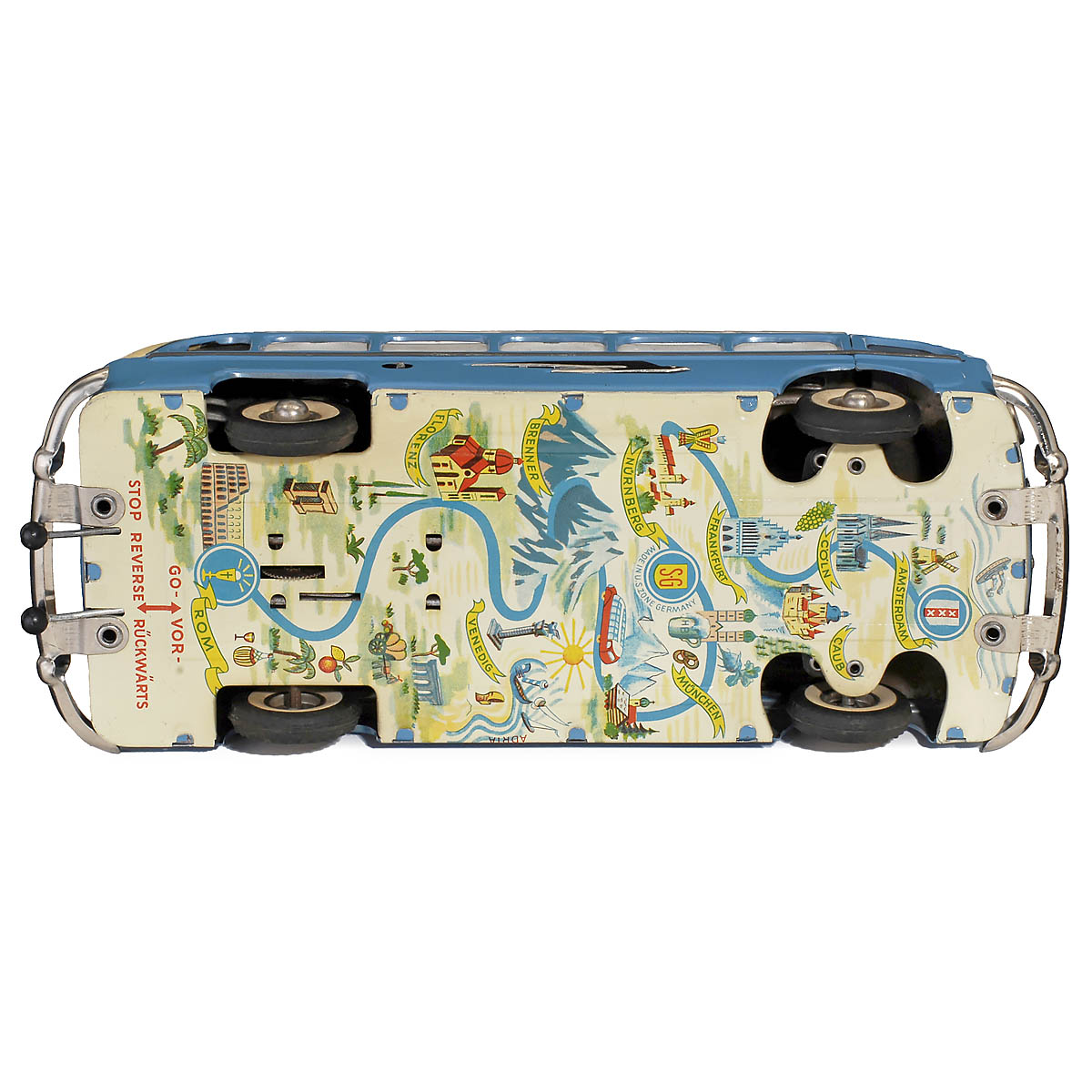 Siegfried Günthermann, Nuremberg, Made in U.S.-Zone Germany. Lithographed tin, spring-driven (working), forward and reverse, sliding roof, baseplate with lithographed round map, rubber tyres, length 11 in. - Near-mint condition!