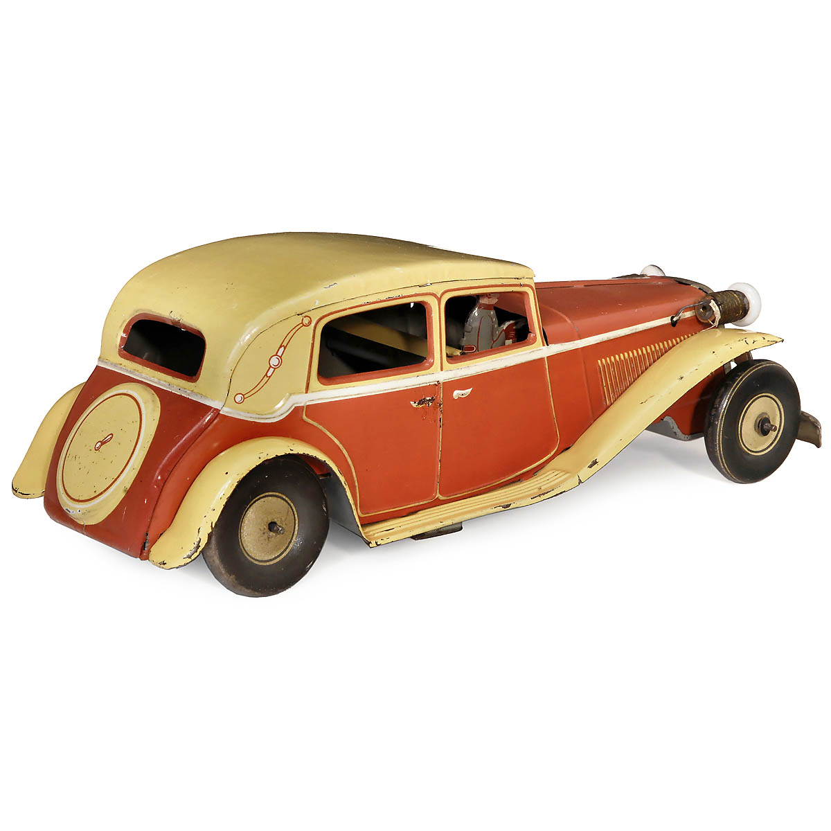 Tipp & Co, Nuremberg, Germany. Pre-war model, lithographed tin, driver figure, spring-driven (working), 2 electrical headlights, length 9 ¾ in. - Very good condition!