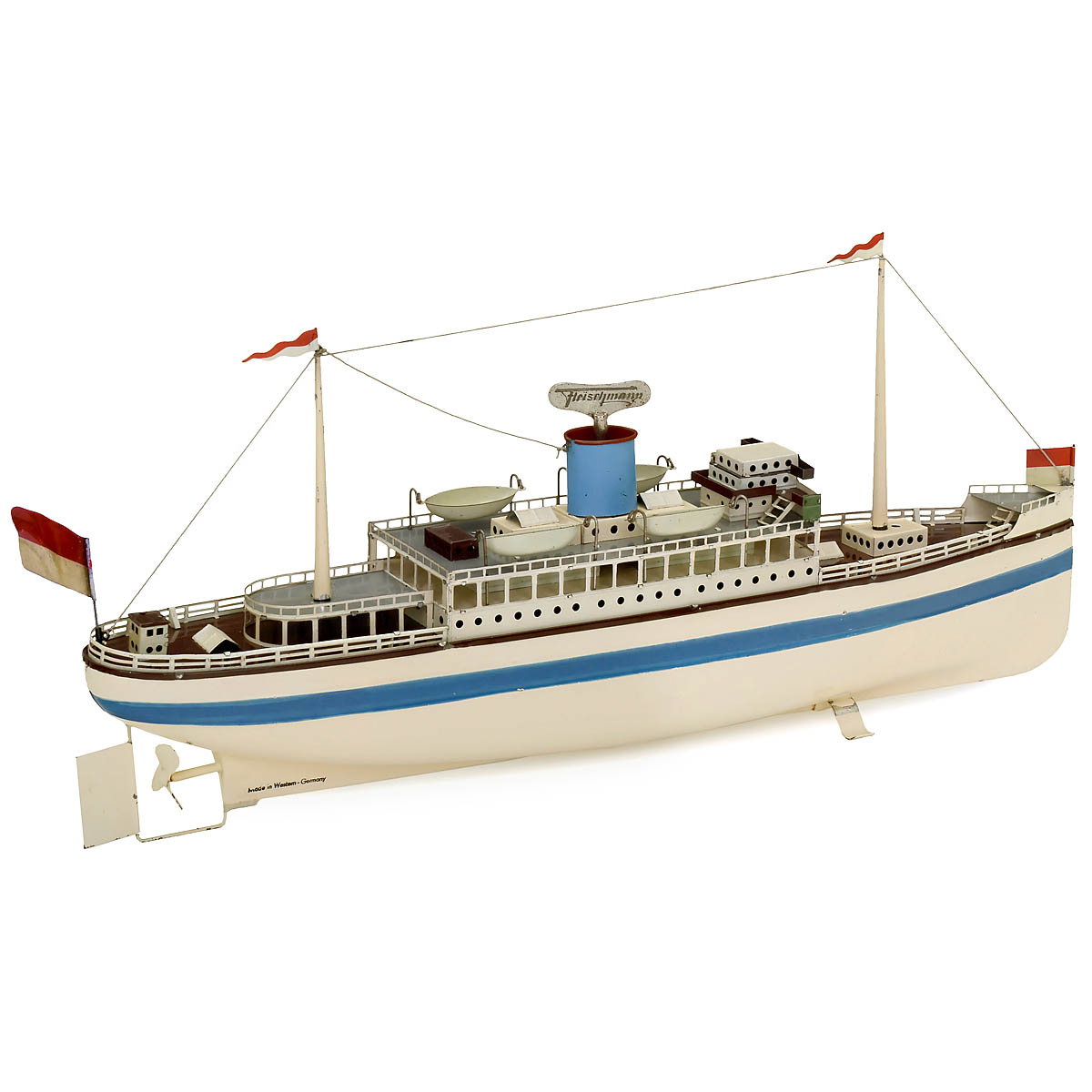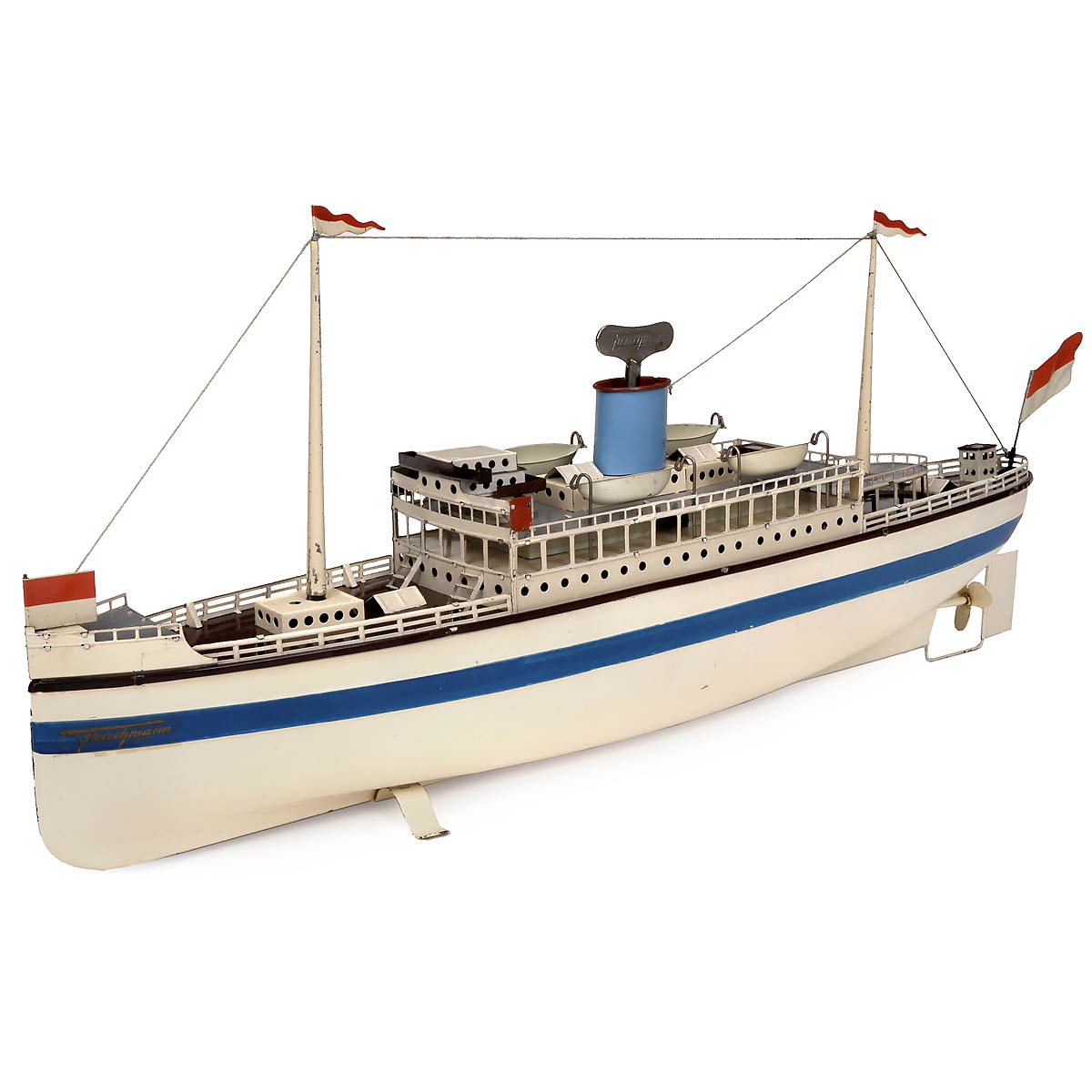 Spring-driven, hand-painted, complete with 4 lifeboats and all flags, length 21 in., near-mint original condition, working.