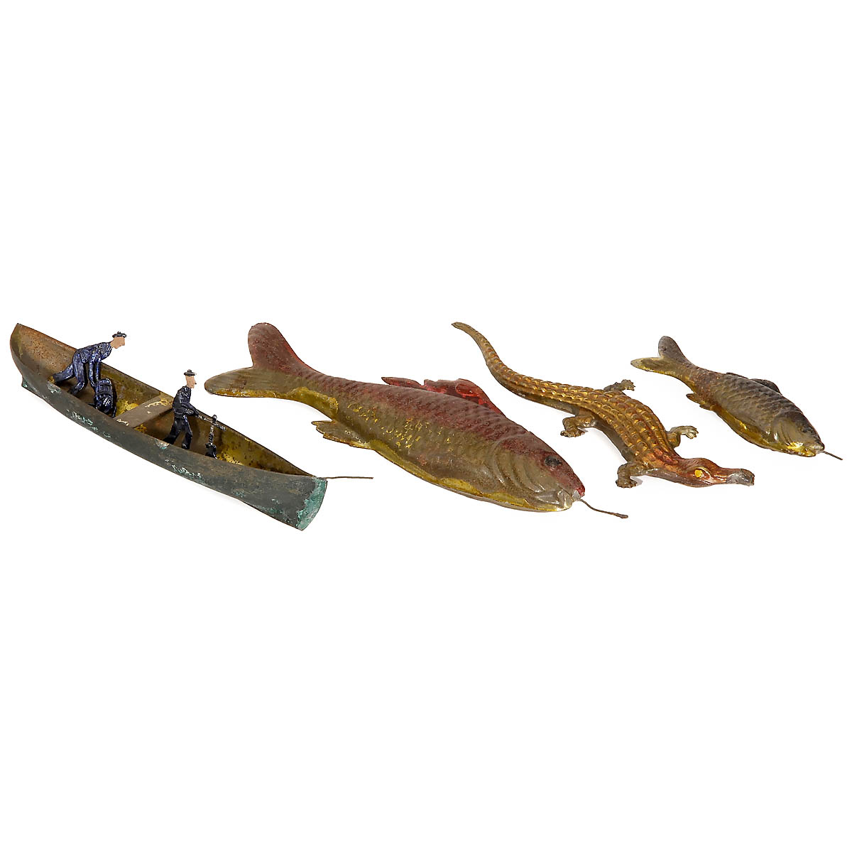 Maker unknown. Hand-painted tin, length 5 in. - In addition: 2 fishes and a crocodile, embossed tin.