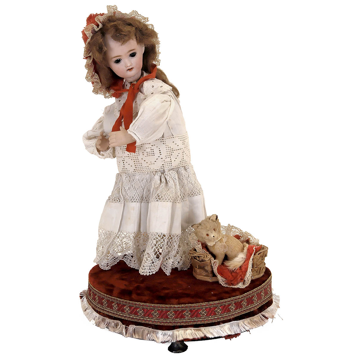 Constructed using antique/vintage parts, depicting a girl and her dog, with bisque head impressed "S 10/0", composition body and single-air musical movement causing figure to move from side to side and lifting the arms, in white cotton dress and red chenille bonnet, on velvet-covered base, ht. 12 ½ in. (32 cm).