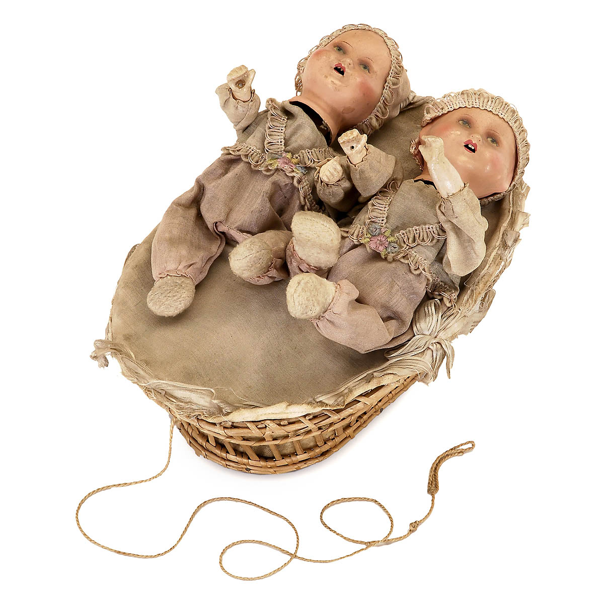Germany, twin babies with original costumes, articulated composition heads, arms and legs, in bassinet basket with bright red wheels on the underside, lg. 11 in. (28 cm).