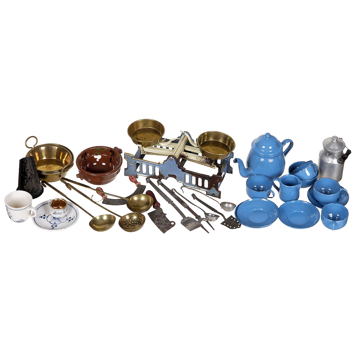 Porcelain, ceramic and celluloid dolls. Ceramic, porcelain, brass and enameled tin pots; various sets of cutlery, cash register, scale, curtain rods, tins, boxes, pictures, coffee grinder, bread boxes and more.