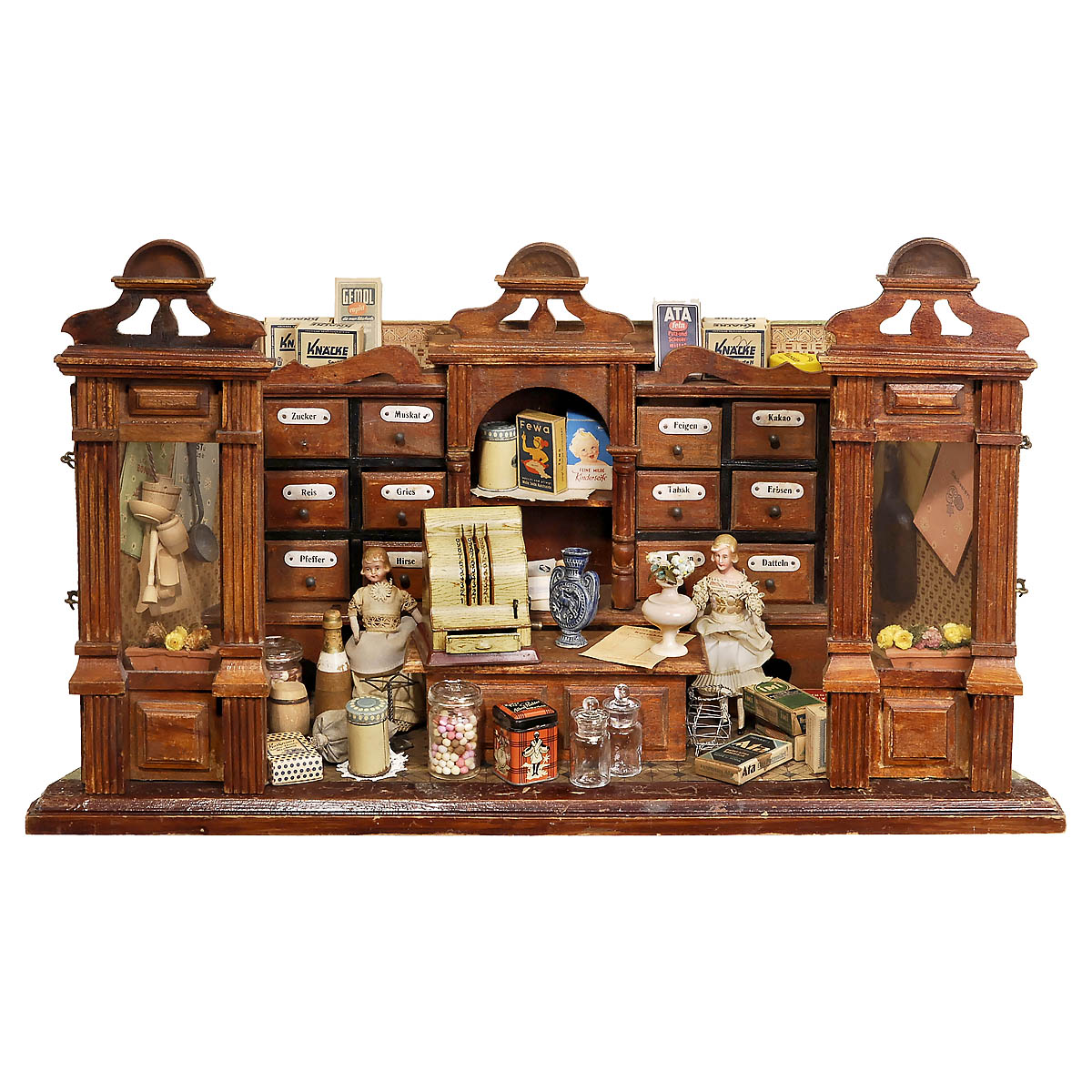 12 drawers in storage cabinet, enamel signs, sales counter, original paper on walls and floor, 24 4/5 x 9 7/8 x 13 ¾ in., with numerous accessories and two bisque dolls.