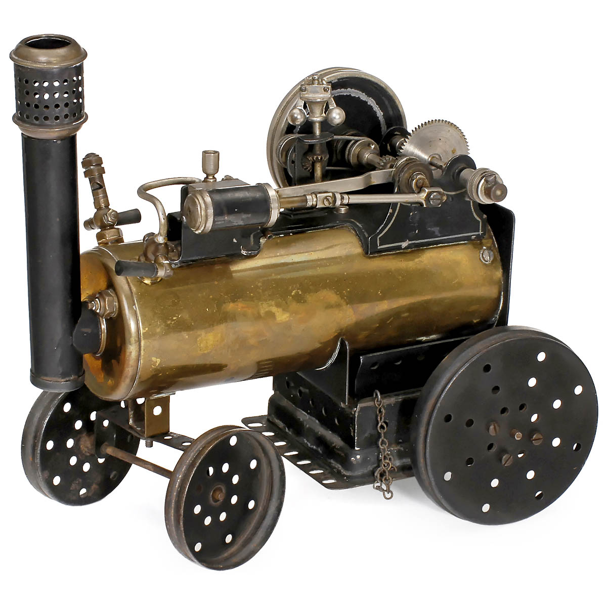 Can be used either as a horizontal or vertical stationary steam engine, or as a steam tractor. With forward or reverse gear, double-action cylinder, steam whistle and stop tap. Cylinder Ø ¾ in., boiler Ø 2 ¾ in., flywheel Ø 2 7/8 in., overall size: 10 ¼ x 5 ½ x 9 3/5 in., complete with burner, oiler lid and rear plate missing, otherwise in good condition!