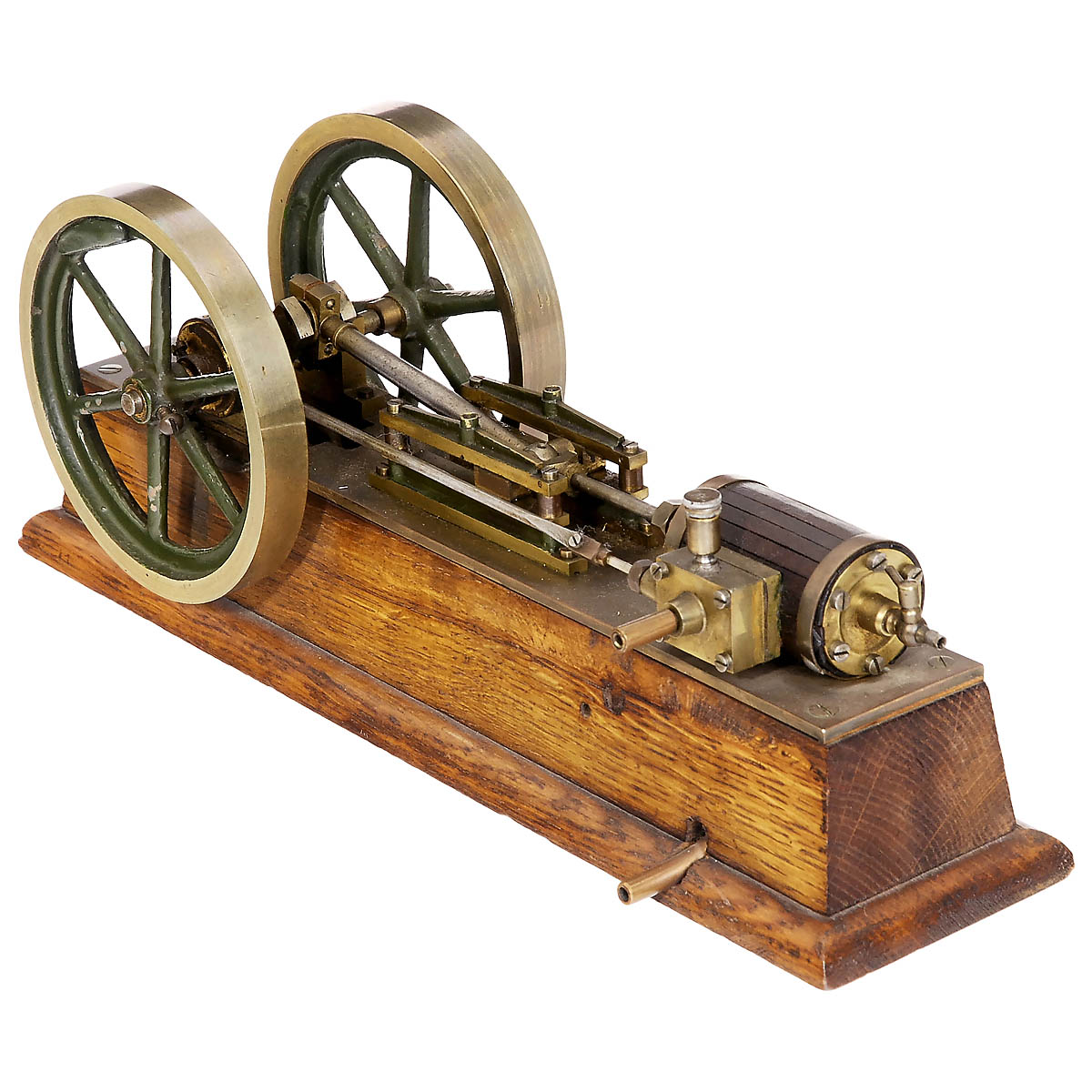 Brass and steel, wood-planked, double-action cylinder, Ø 1 ¼ in., water drainage tap, slide valve control, crosshead guide, 2 flywheels, Ø each 4 2/5 in., on oak base 13 3/5 x 3 1/8 in.