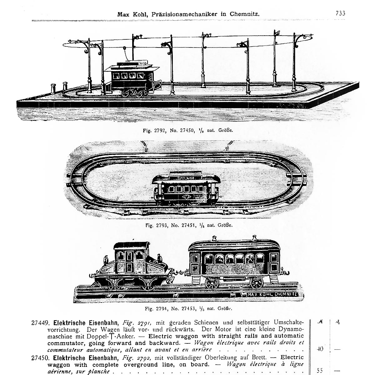 Precision-built brass locomotive with 12-volt alternating current motor, canopy and turned brass railing, for 2-inch (5,5 cm) gauge rails, in original mahogany case. The locomotive is accompanied by original oval circuit on folding mahogany board, in matching storage case, circuit 42 ½ x 20 ½ in. (108 x 52,5 cm). - Literature: See 1900 catalog of physical demonstration apparatus, Max Kohl, Chemnitz, p. 733, for a similar (but later) demonstration model. - An early scientific toy, the only example of its kind we have seen to date.