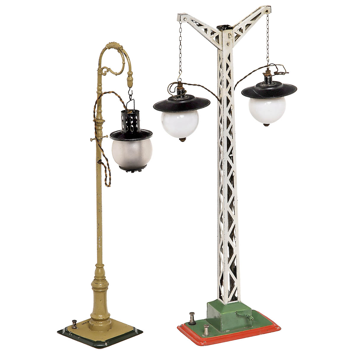 Electric illumination, hand-painted tin. 1) Arc lamp, height 14 ½ in. - And: 2) Double arc lamp, height-adjustable, height 15 ½ in.