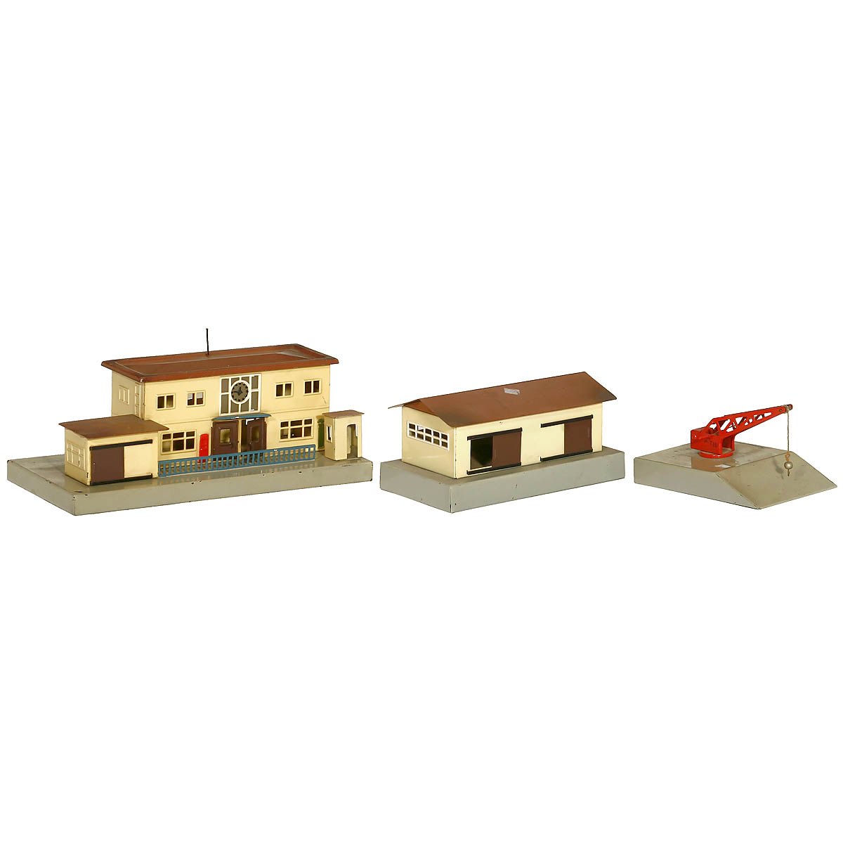 Gauge H0, stamped tin. 1) Station building 414, version 2, opening doors, 10 1/5 x 4 ¾ x 4 in. - 2) Loading ramp with crane 429, version 5, 5 ¼ x 3 ½ in. - And: 3) Freight shed 428, version 2, 6 ¾ x 3 ½ x 3 1/6 in.