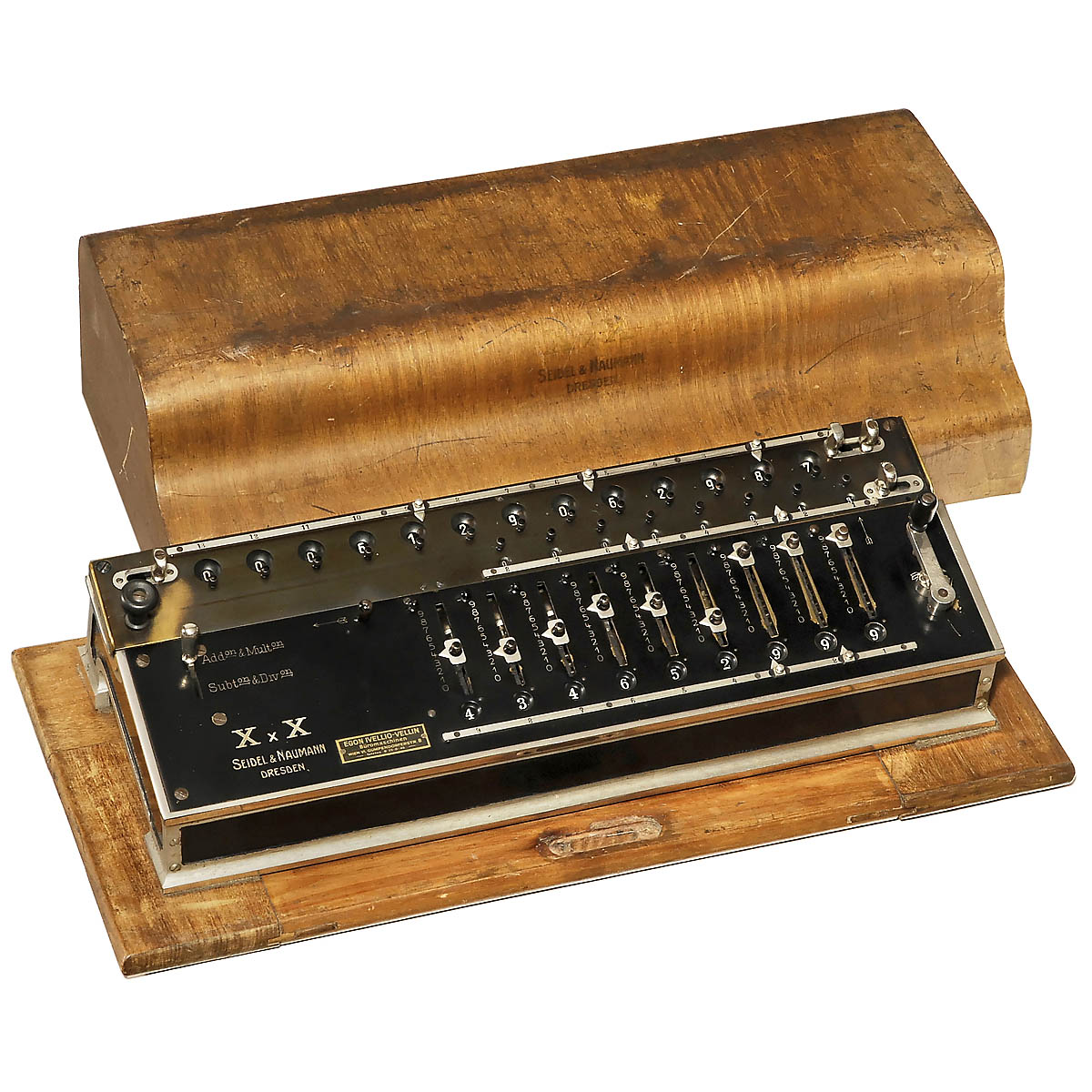 Rare German stepped-drum calculating machine by Seidel & Naumann, Dresden. With original wood cover. 9, 8 and 13 digits. Serial no. 1034. - Very interesting and rare collector's item in good working order!