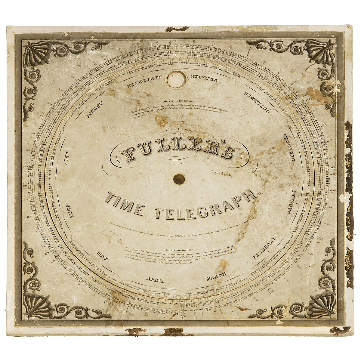 USA. Double-faced circular calculator, 11 in. square cardboard, front with Fuller's Time Telegraph which enables the number of days, weeks or months to be determined between two given dates without calculation. Reverse with Palmer's Computing Scale, logarithmic scales on two circles to calculate different mathematical problems.