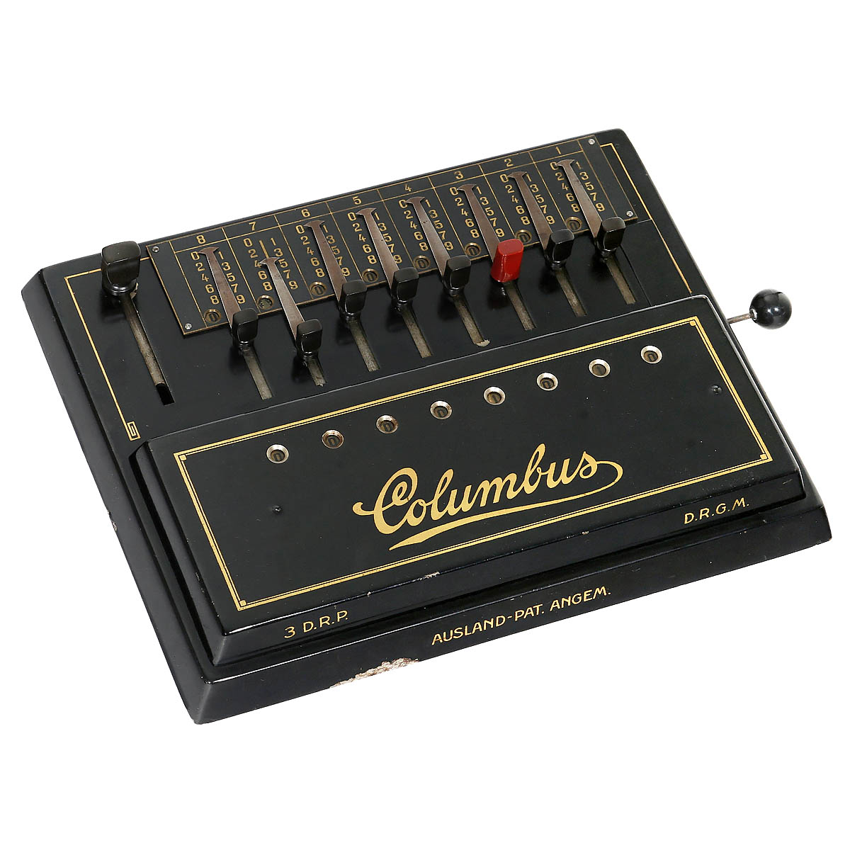 Extremely rare set-rack adding machine by Klein & Seitter, Stuttgart. With 8 set slides, tens transfer, clearing key. According to German patents no. DRP 219856 and 222480. - A giant rarity!