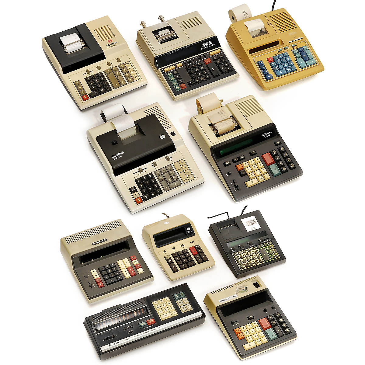 1) Olivetti Divisumma 37 PD. - 2) Triumph 121 PD. - 3) MBO TRS 2000 PDC. - 4) Compet CS-1102. - 5) Triumph 1217. - 6) Olympia CPD 5212. - 7) Olympia CPD 5211. - 8) Burroughs C-2000. - 9) Facit 1118. - And: 10) Casio AS-L, with Nixie tubes. - Several with printers, all working.