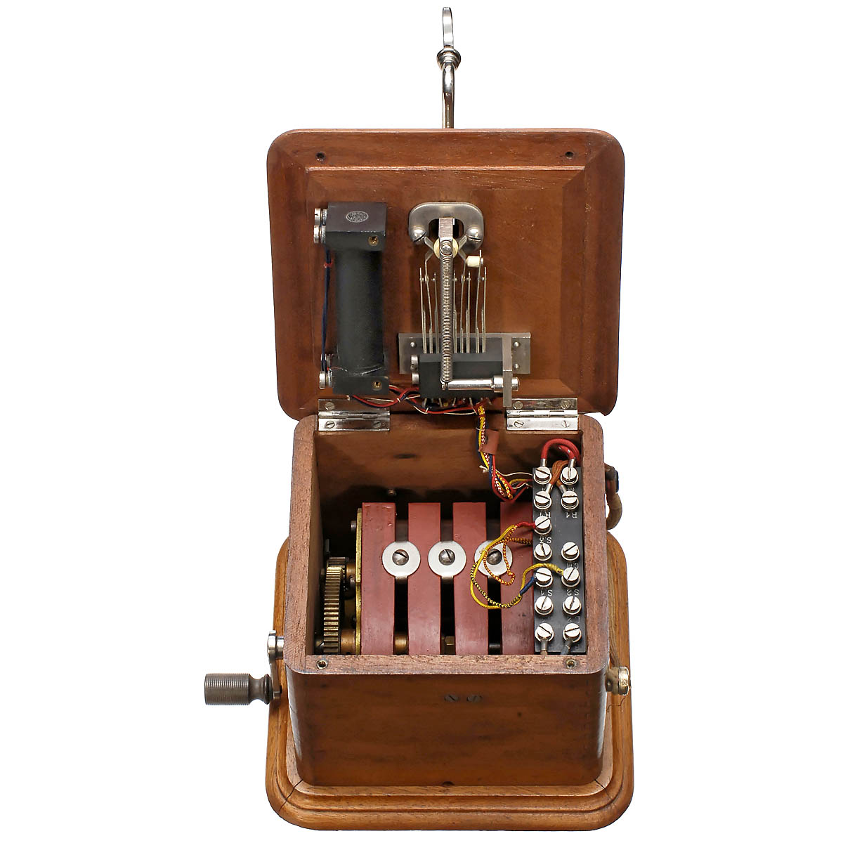 French standard model between 1910 and 1942, only local operation, with original handset and second earphone, mahogany case, brass plaque on the front "Propriété de L'Ètat" (property of the state).