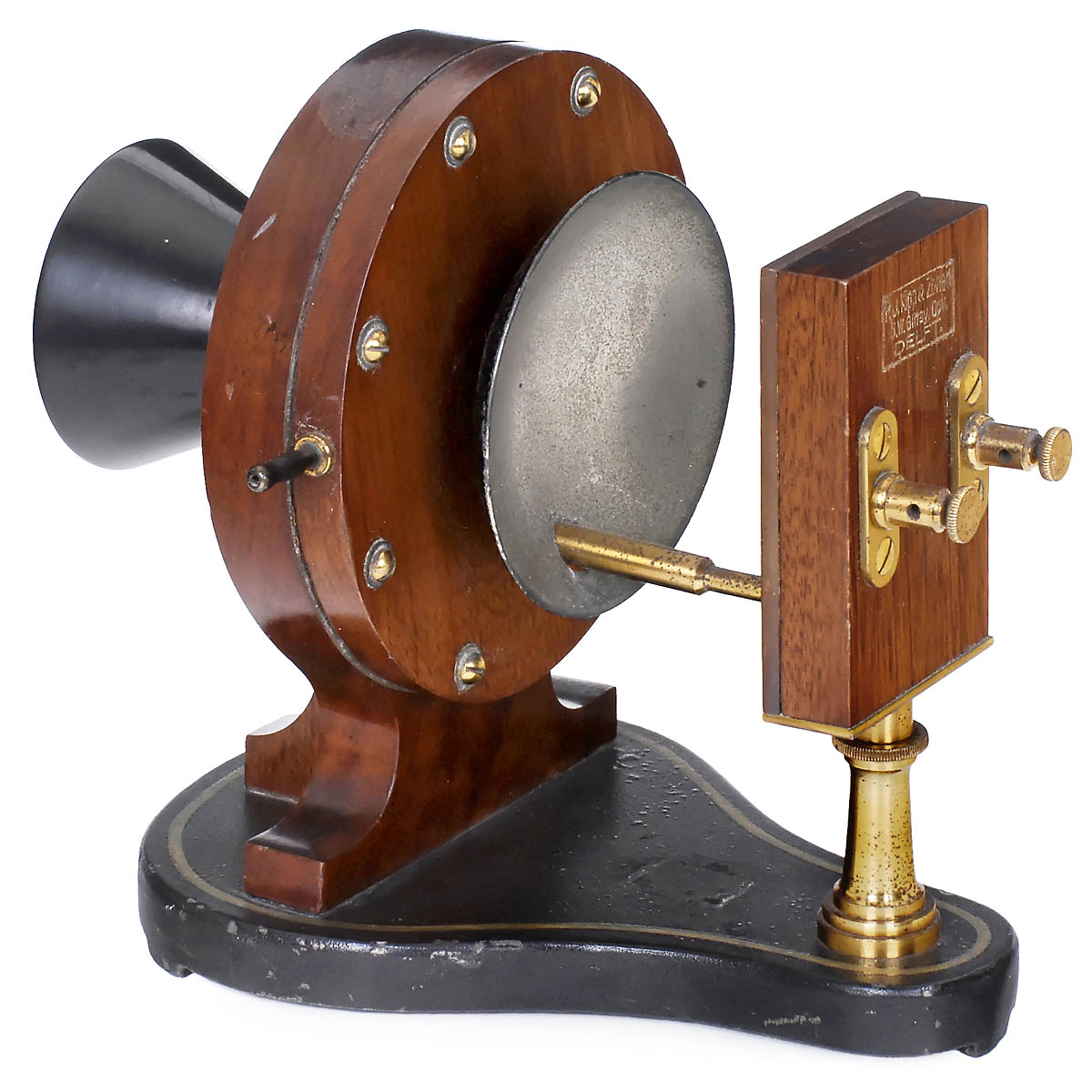 Used for the conversion of human voice into an electrical signal, with acetylene light flame and a selenium cell. Manufactured by Kipp & Zonen - Delft. Consisting of: Speaking horn, mahogany case with gas line, parabolic mirror, gas nozzle and selenium cell, on cast-iron base, size 8 ¾ x 5 ¼ x 7 in. Excellent condition, the only known example today.