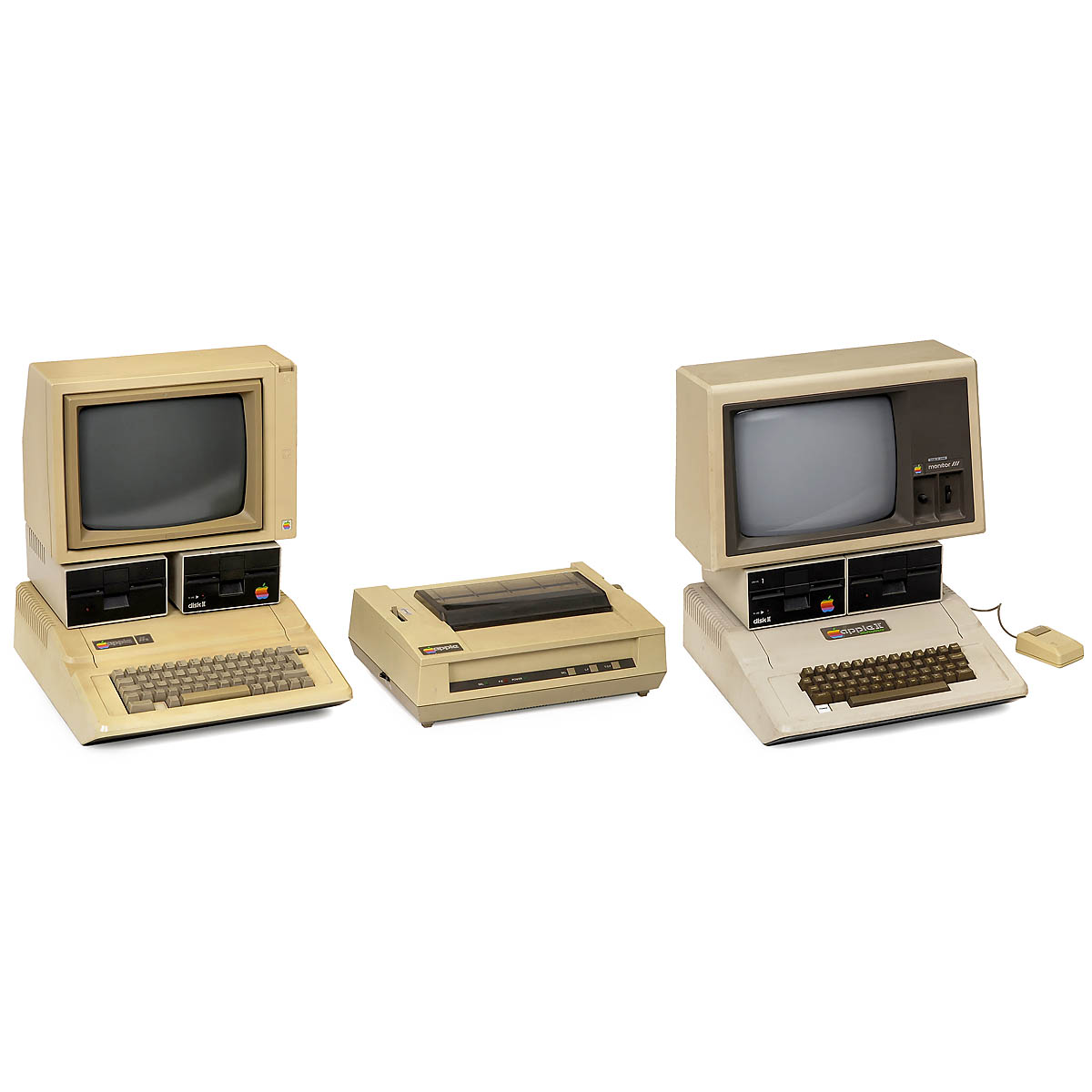 1) Apple II europlus, with 2 disc drives and Monitor III, 1979 onwards. - And: 2) Apple IIe, with 2 disc drives and monitor, 1983 onwards. - In addition: Apple Dot Matrix Printer, 9-pin, wires and Apple mouse. - All equipment untested.
