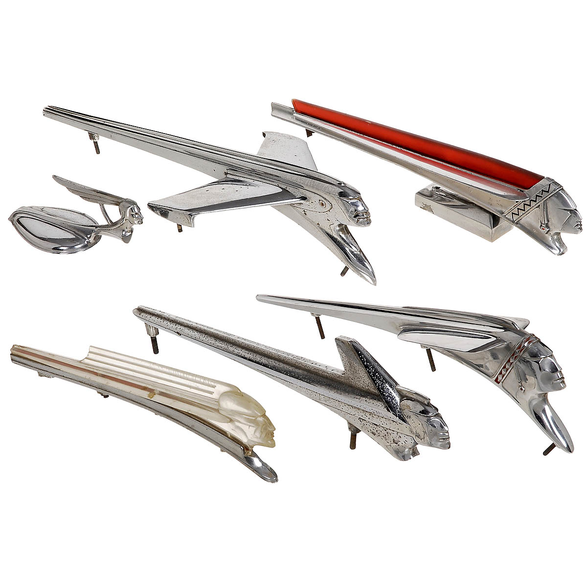 1) Pontiac Chieftain, Indian head, illuminated, 1946, no. 508615. - 2) Pontiac Chieftain, Indian head, 1952, no. 515594. - 3) Probably Big Six, Indian chief, 1930. - 4) Flying Indian, c. 1948. - 5) Indian chief, head on jet airplane, 1950, no. 513747. - And: 6) Plastic, c. 1947, no. T 29812.