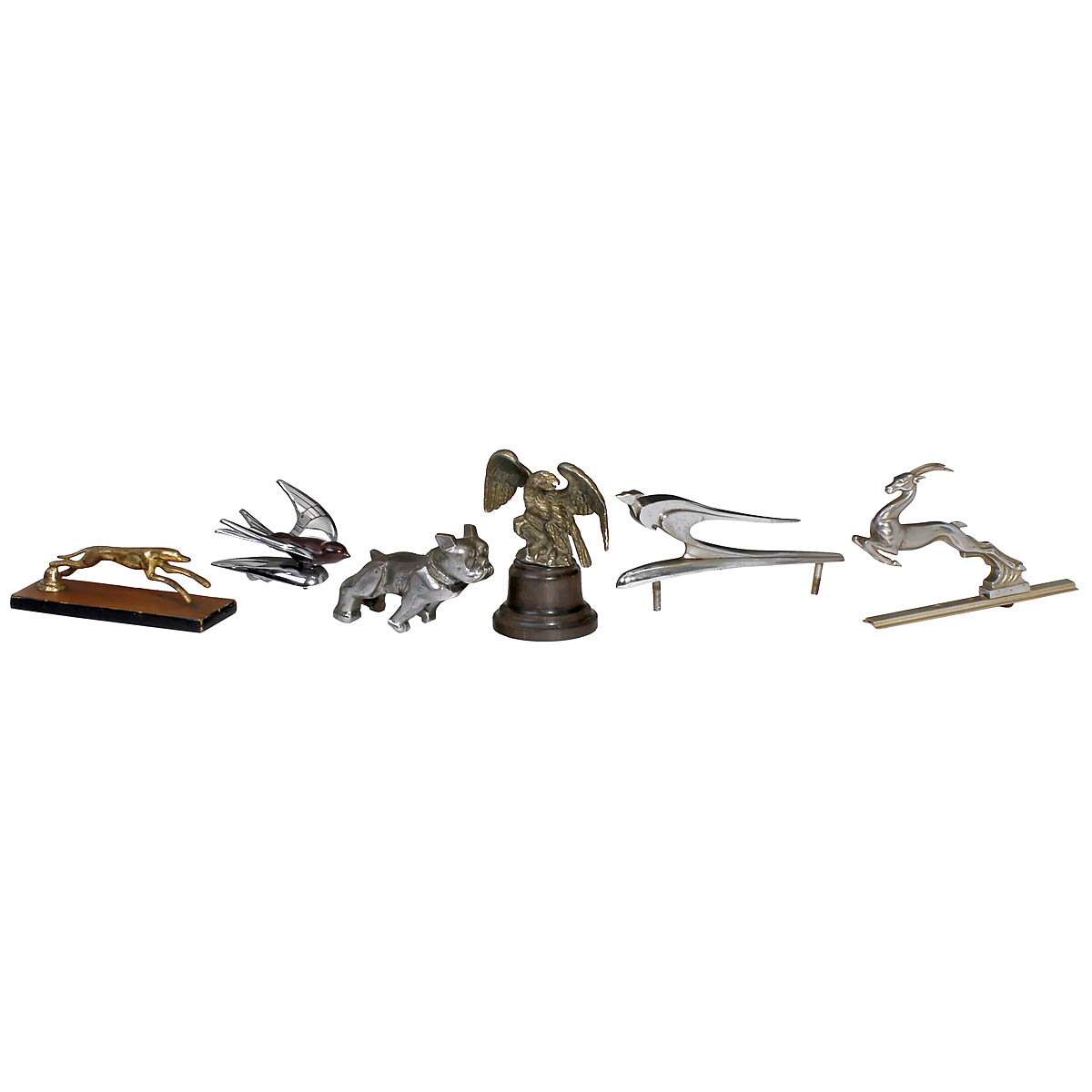 Animal mascots. 1) Greyhound, bronze. - 2) Kangaroo, triple chromed, Art-Deco style. - 3) Springbok, chromed bronze. - 4) Swallow, bakelite and chromed tin. - 5) Eagle, nickeled bronze. - And: 6) Mack, bulldog, chromed.